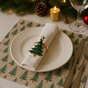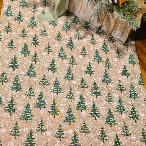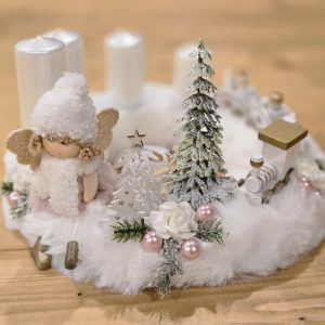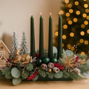 Aranžmán je bohato zdobený kombináciou zasnežených vetvičiek, eukalyptu, bobúľ, šišiek, dekoratívnych guľôčok a výrazných zlatých akcentov. Unikátnym detailom sú drevené domčeky a roztomilé lesné zvieratko, ktoré dodávajú celej dekorácii teplo domova a rozprávkový nádych.