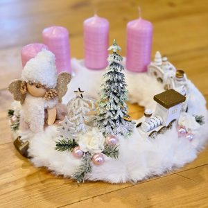 Kožušinový adventný veniec má priemer 30cm. Je dozdobený umelými nerozbitnými doplnkami, vláčik je drevený, postavička látková.