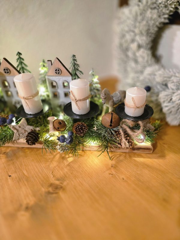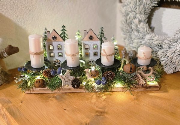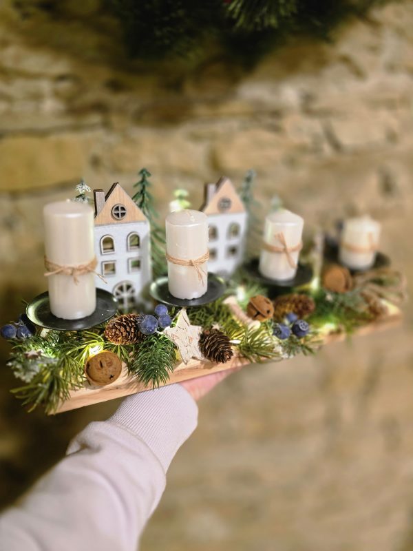 Adventný veniec na drevenom podstavci s LED svetom. Ozdobený prírodnými doplnkami a domčekmi. Cena uvedená bez sviečok.