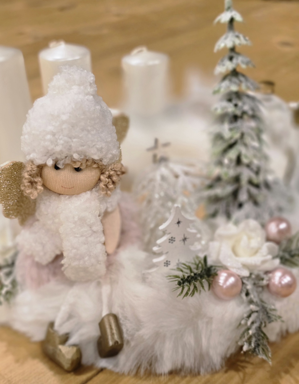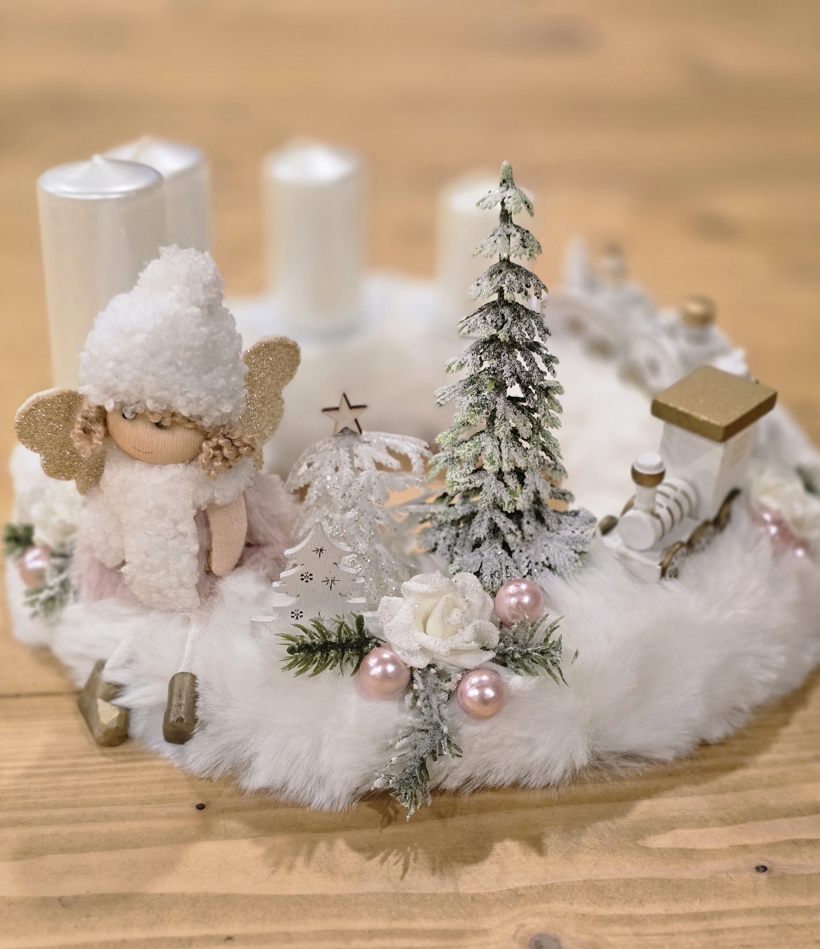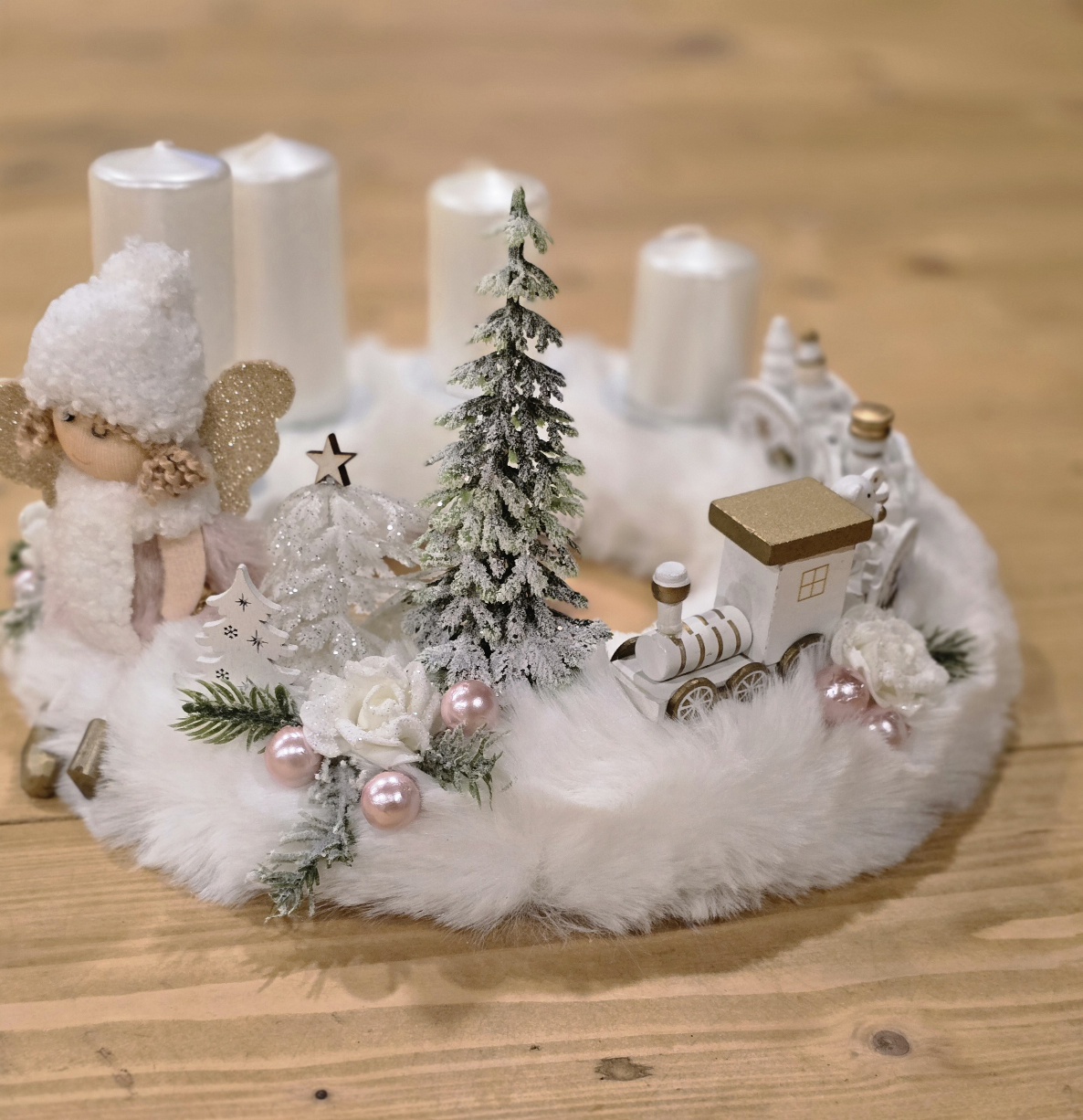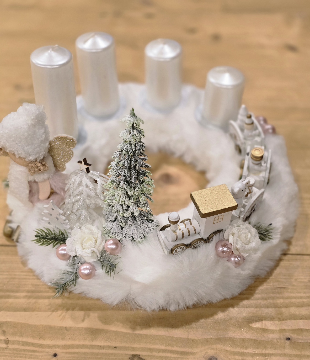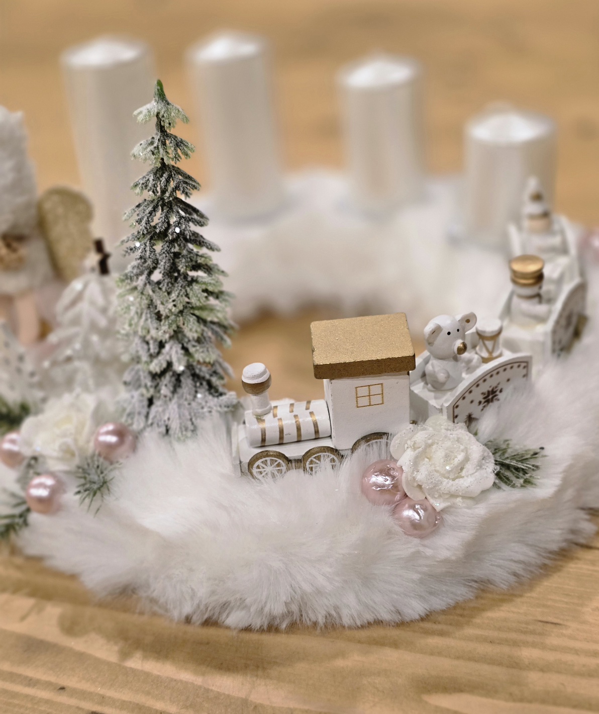 Kožušinový adventný veniec má priemer 30cm. Je dozdobený umelými nerozbitnými doplnkami, vláčik je drevený, postavička látková.
