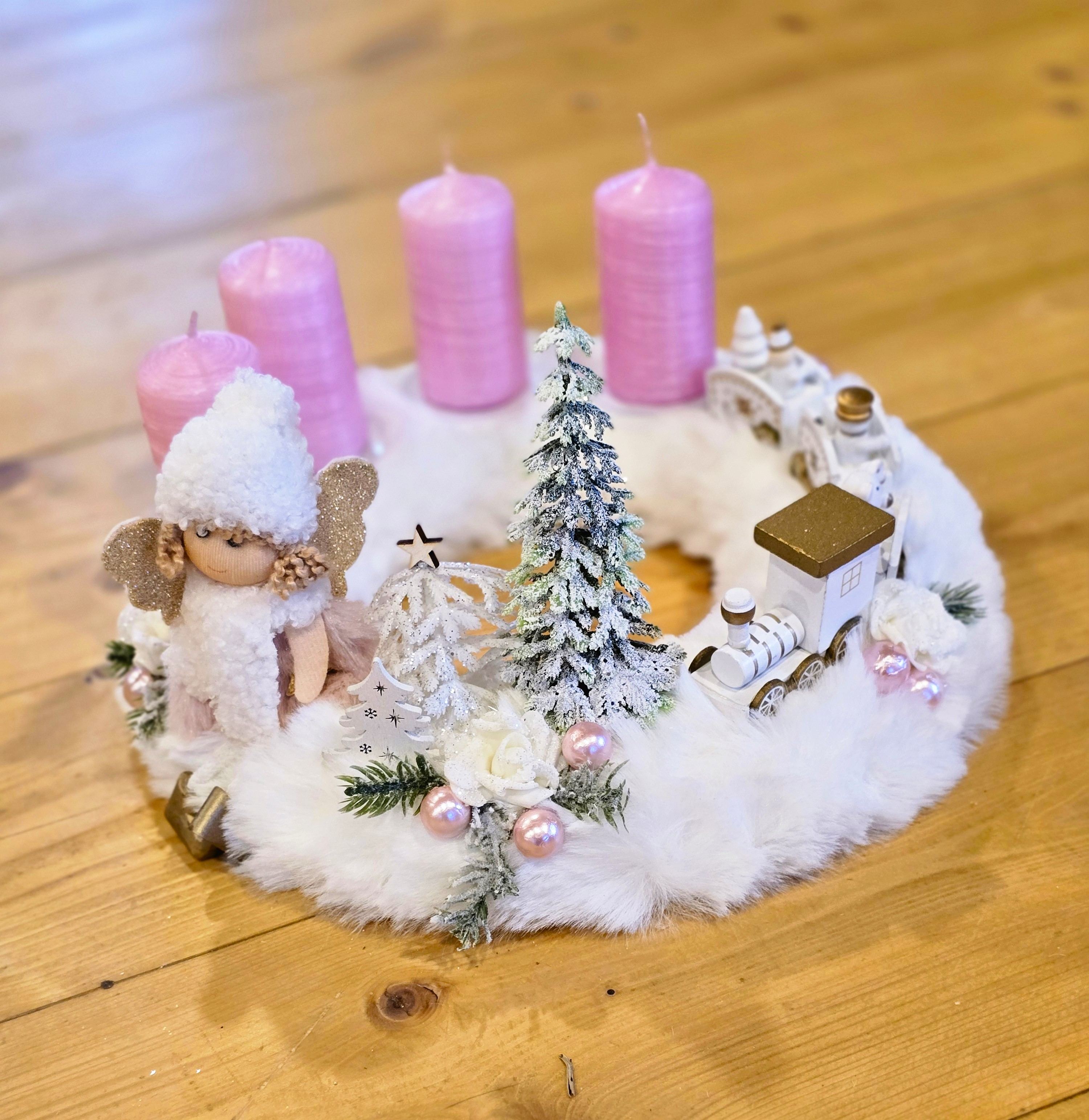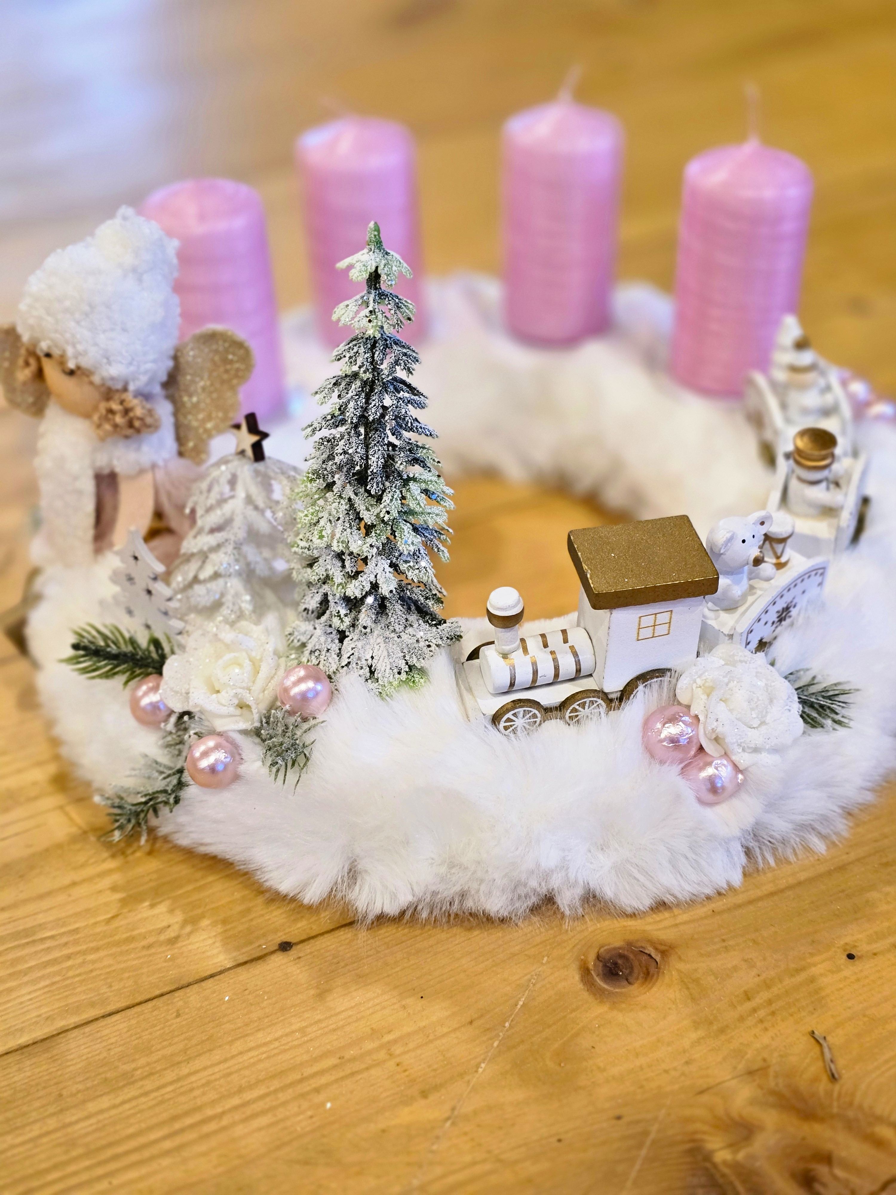 Jemný ručne vyrábaný adventný veniec / adventný svietnik, ladený do ružových, bielych a zlatých tónov, ktorý pôsobí nežne, čisto a rozprávkovo. Dominantou aranžmánu sú štyri ružové adventné sviečky, doplnené o anjelika, zasnežené stromčeky, drobný vláčik, zimné dekorácie a jemné ozdoby.