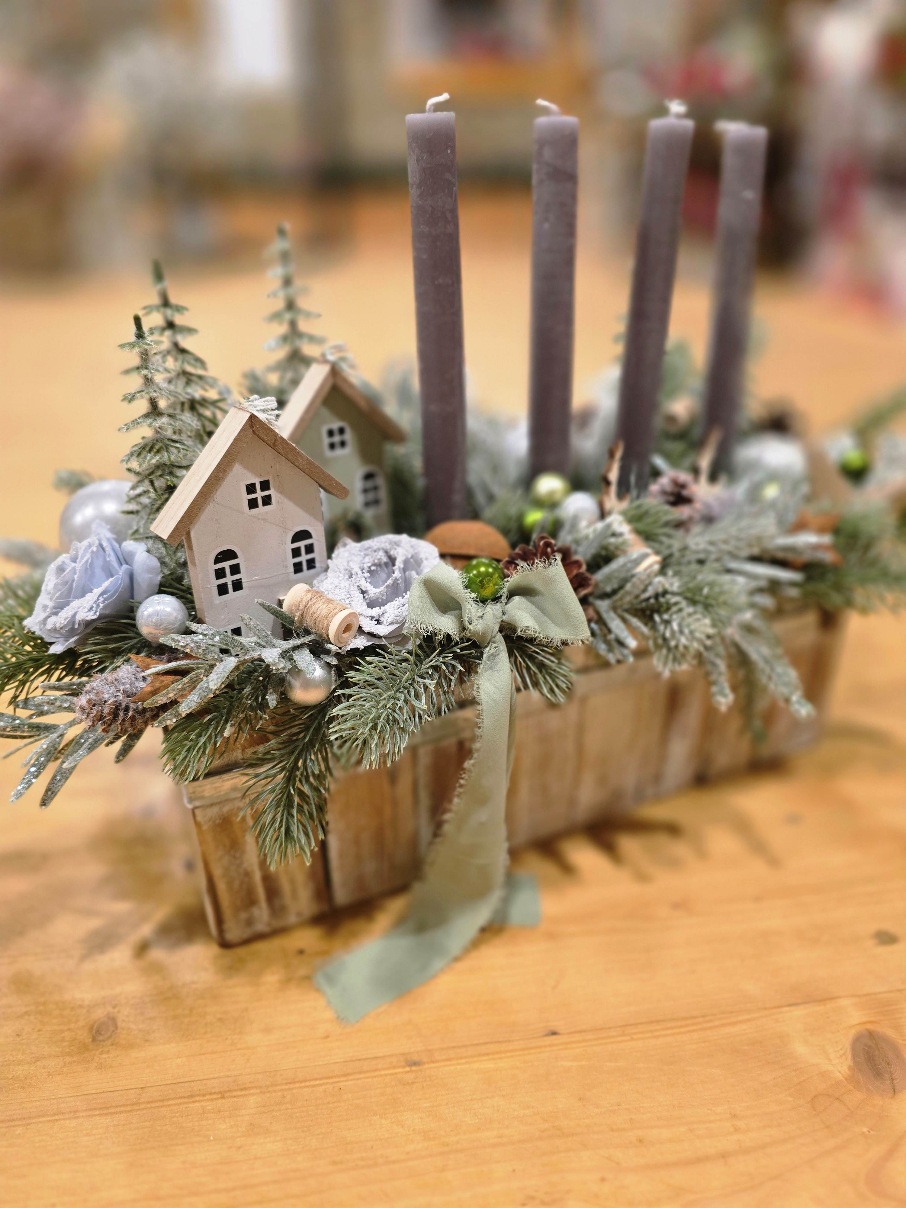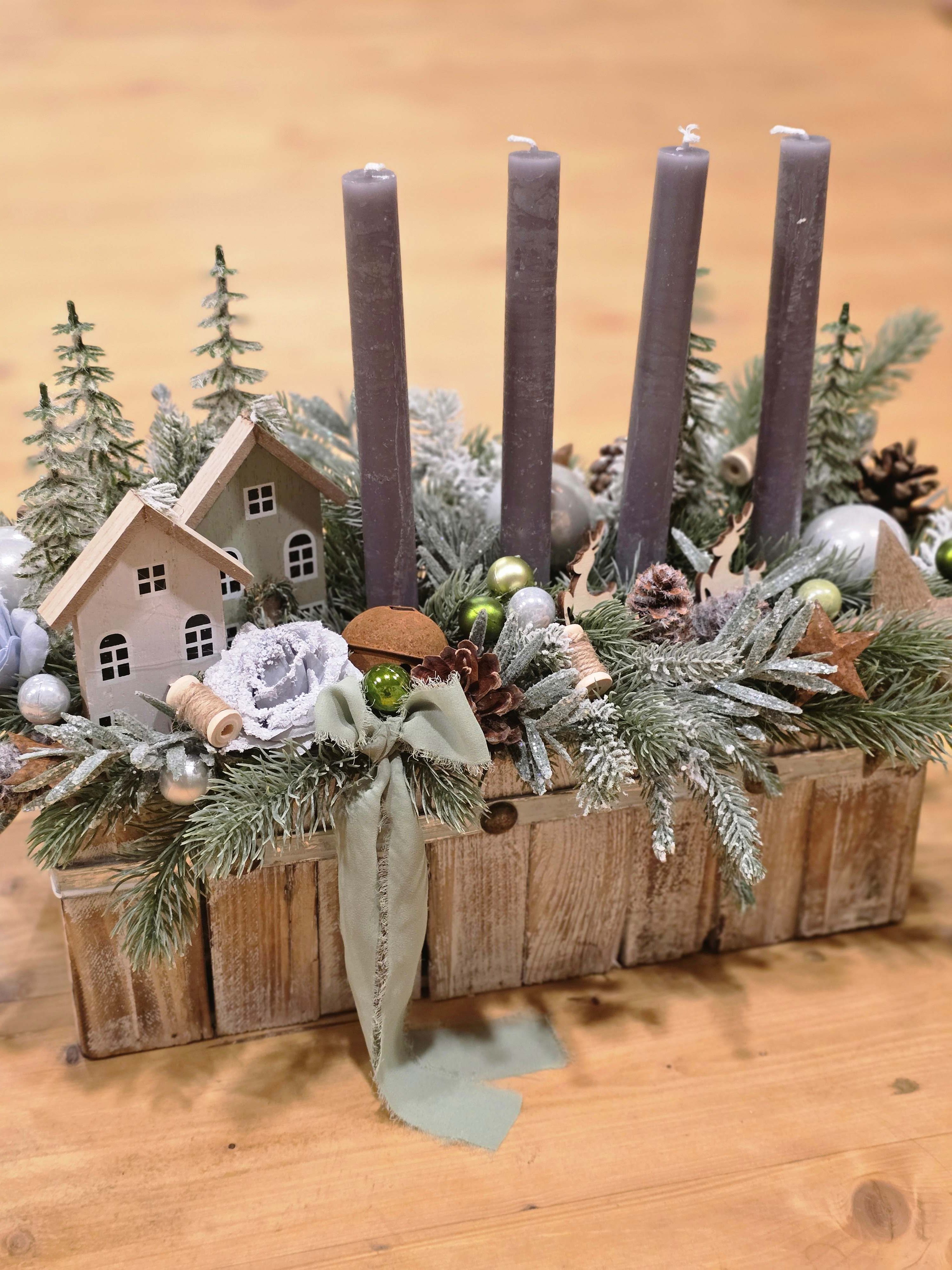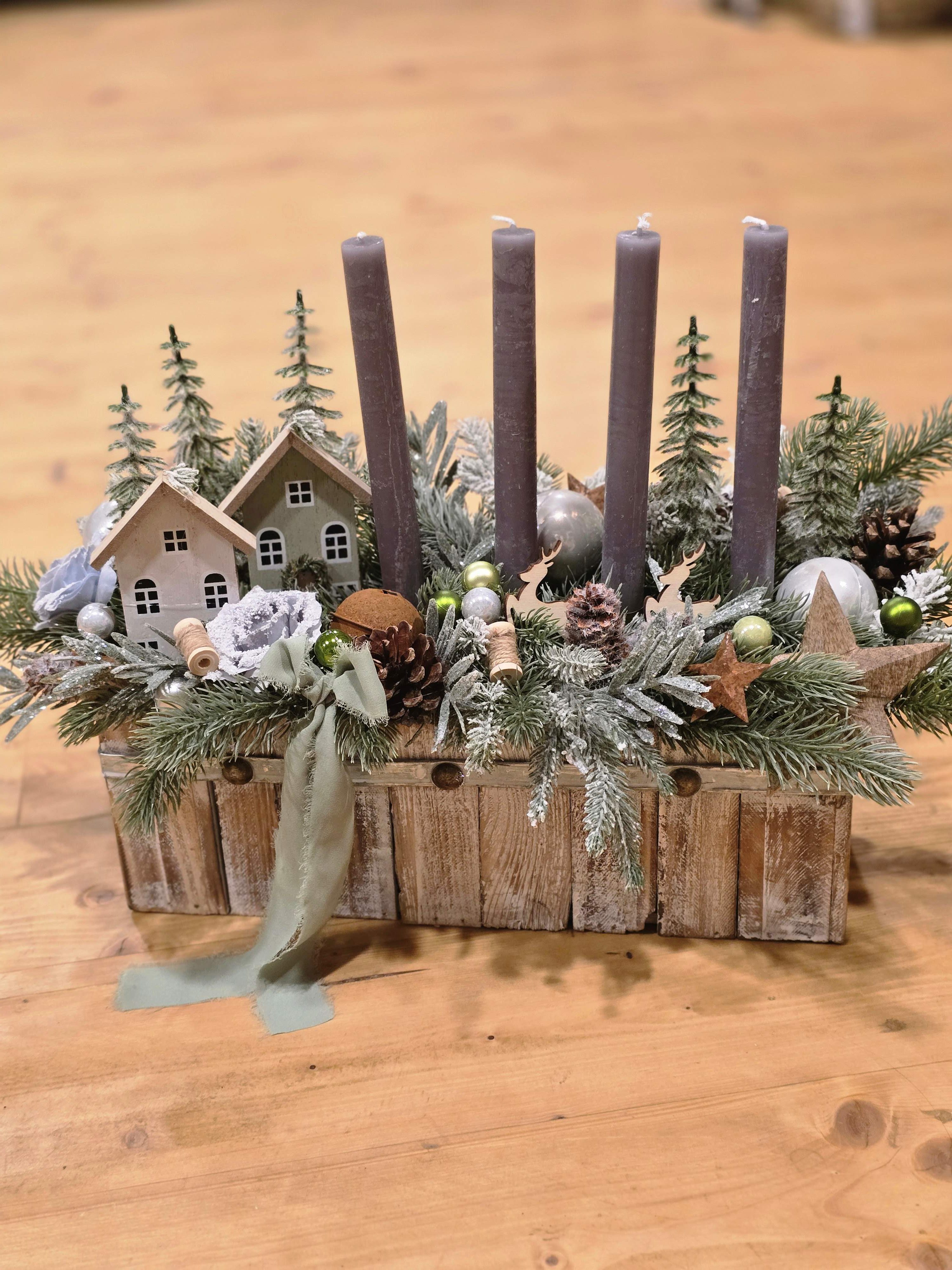 Vneste do svojho domova tú pravú zimnú atmosféru s týmto nádherným adventným svietnikom v rustikálnej drevenej nádobe. Ručne vytvorená dekorácia spája eleganciu, teplo domova a čaro Vianoc. Svietnik je bohato zdobený detailnými prvkami, ktoré pôsobia mimoriadne luxusne a zároveň veľmi prirodzene.