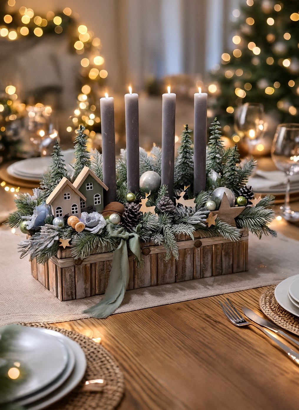 ✨ Drobné jeleňe, hviezdičky a lesné prvky – dodávajú aranžmánu magický „lesný“ nádych
