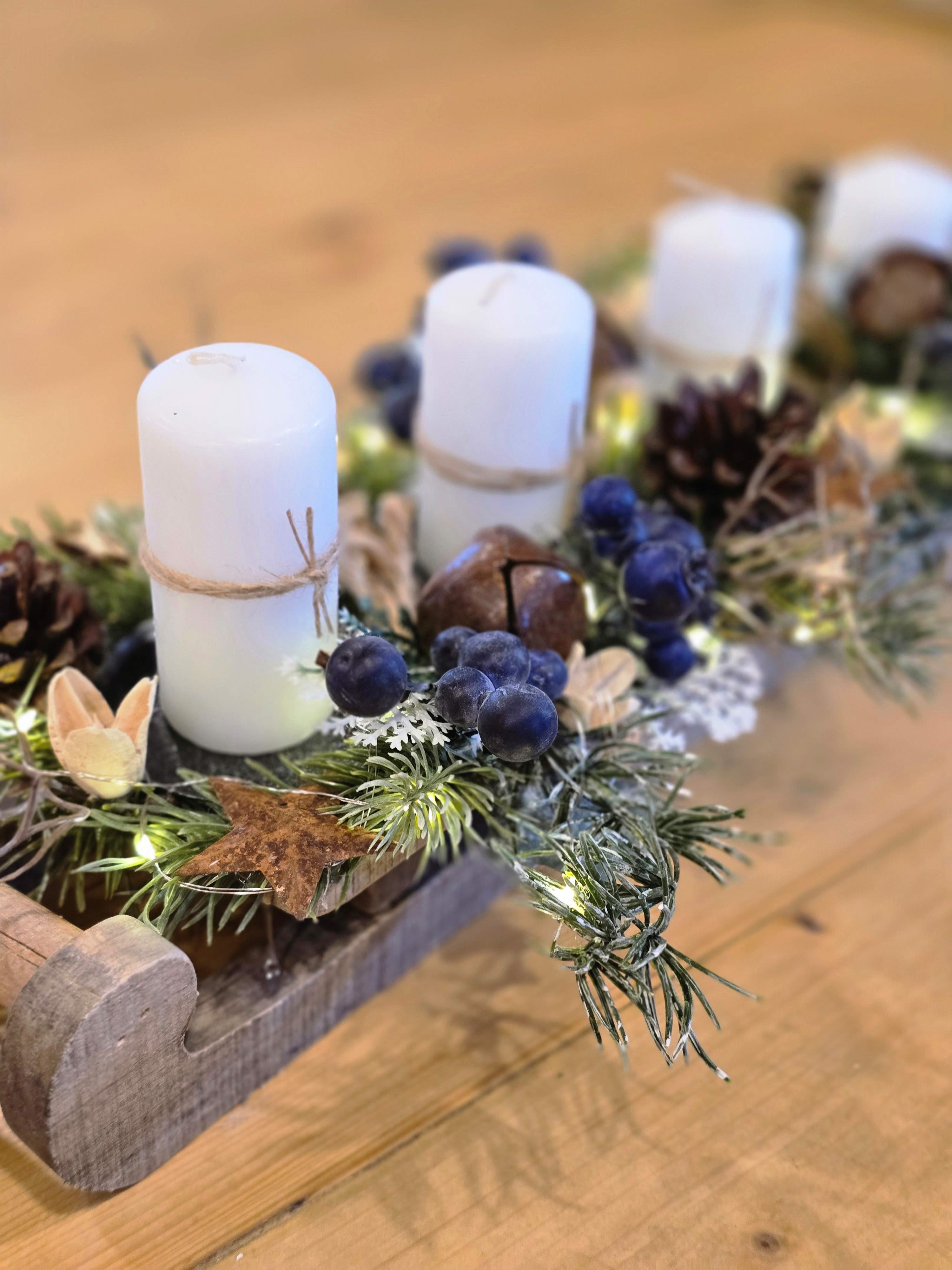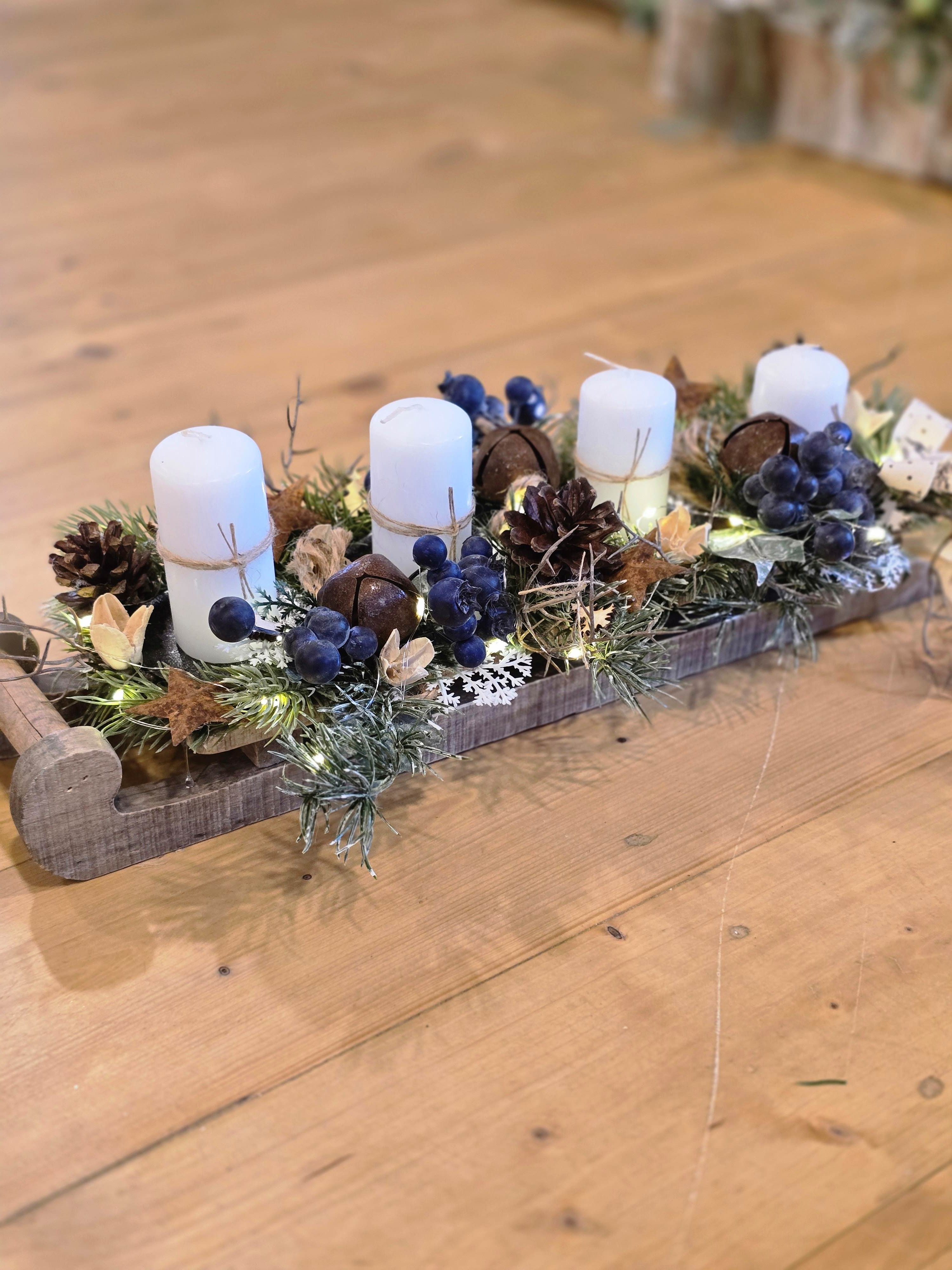 Vytvorte si doma tú pravú vianočnú atmosféru s týmto nádherným ručne robeným adventným svietnikom na drevených saniach. Svietnik je zdobený kvalitnými adventnými sviečkami, umelým zasneženým ihličím, prírodnými šiškami, bobuľami, hviezdičkami a jemnými detailmi, ktoré pôsobia luxusne, no zároveň veľmi prirodzene. Svietnik je ešte podsvietený LED svetielkami.