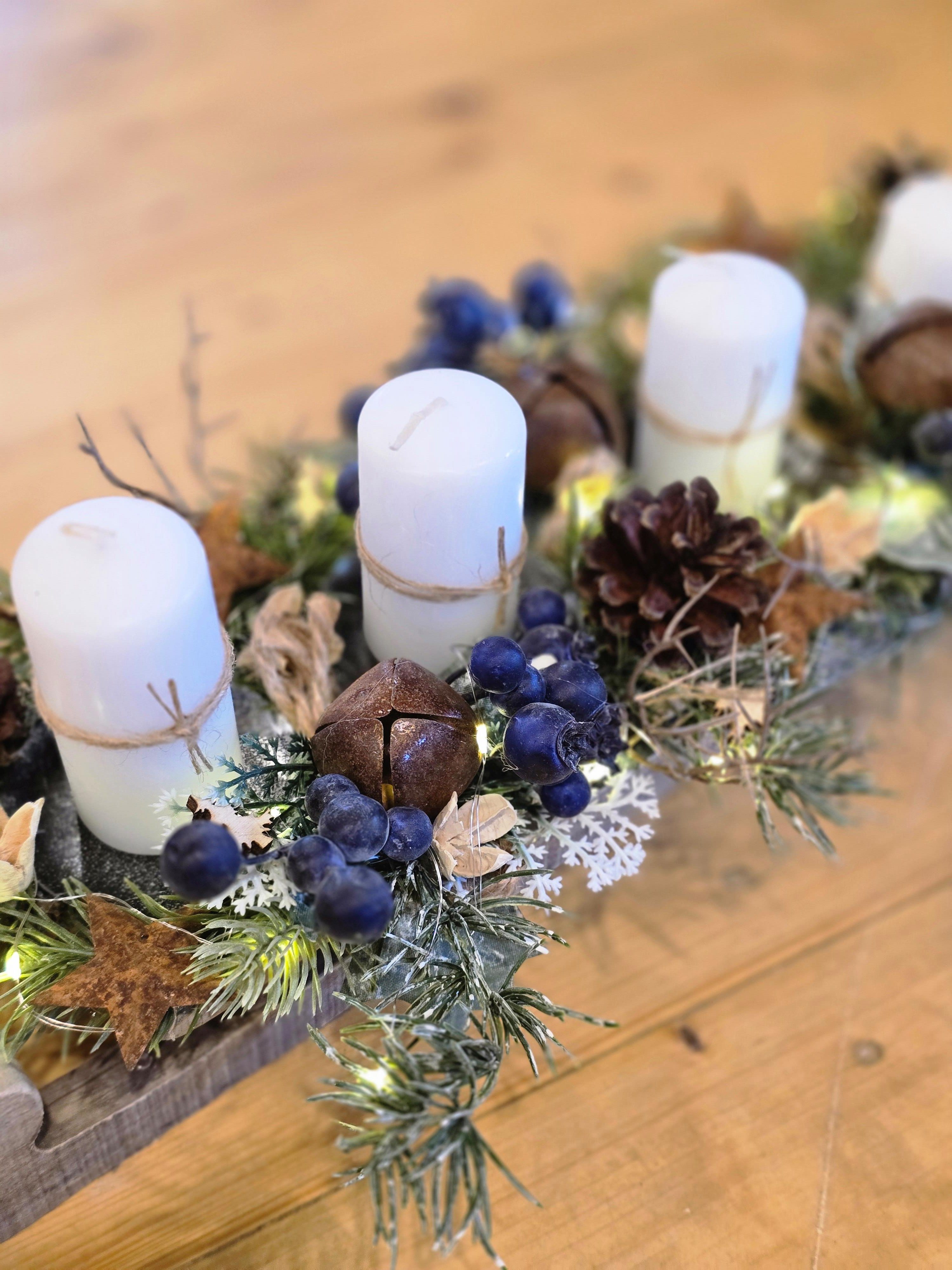 Celá aranžmán je vytvorená tak, aby pôsobila harmonicky a elegantne. Ozdoby sú pevne uchytené, čo zabezpečuje dlhú životnosť dekorácie – môžete ju používať nie len počas adventného obdobia, ale aj vianočných sviatkov.