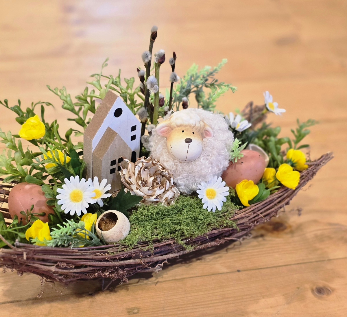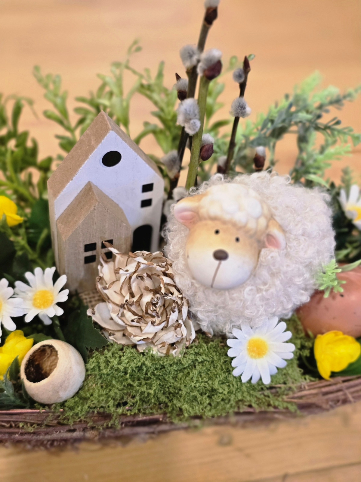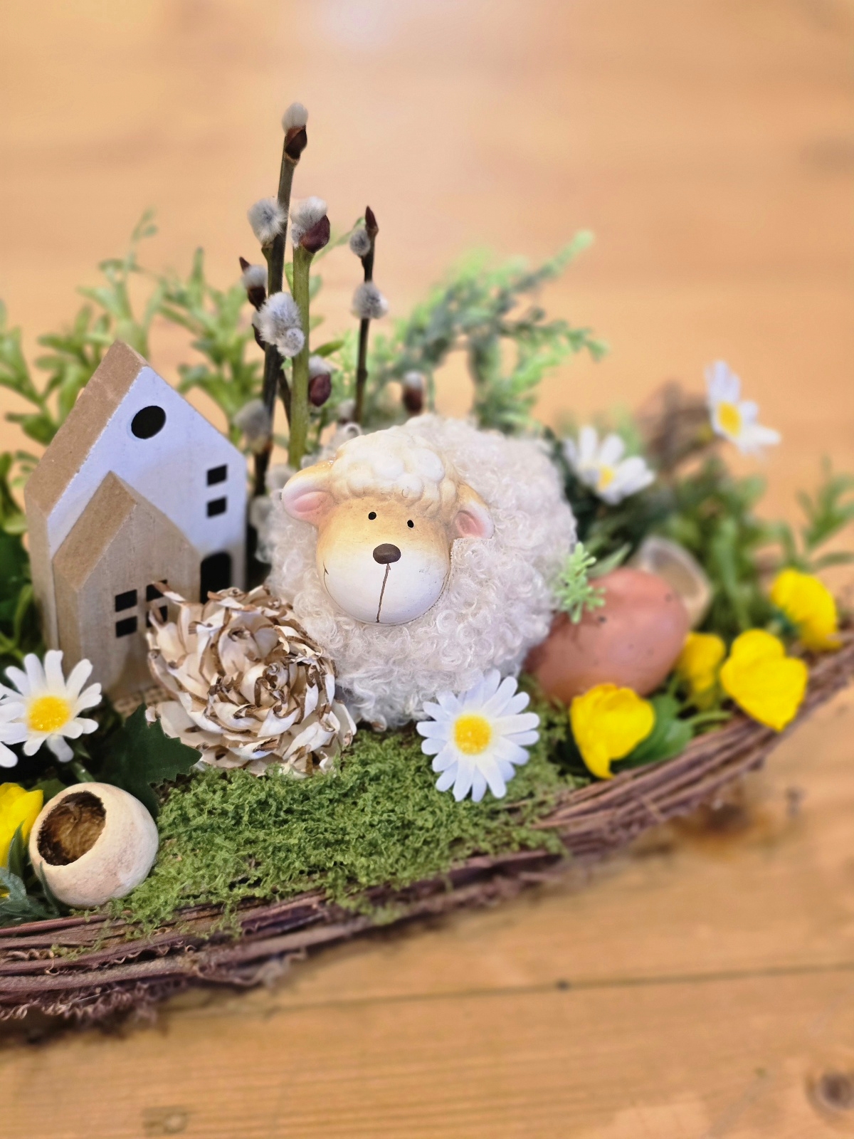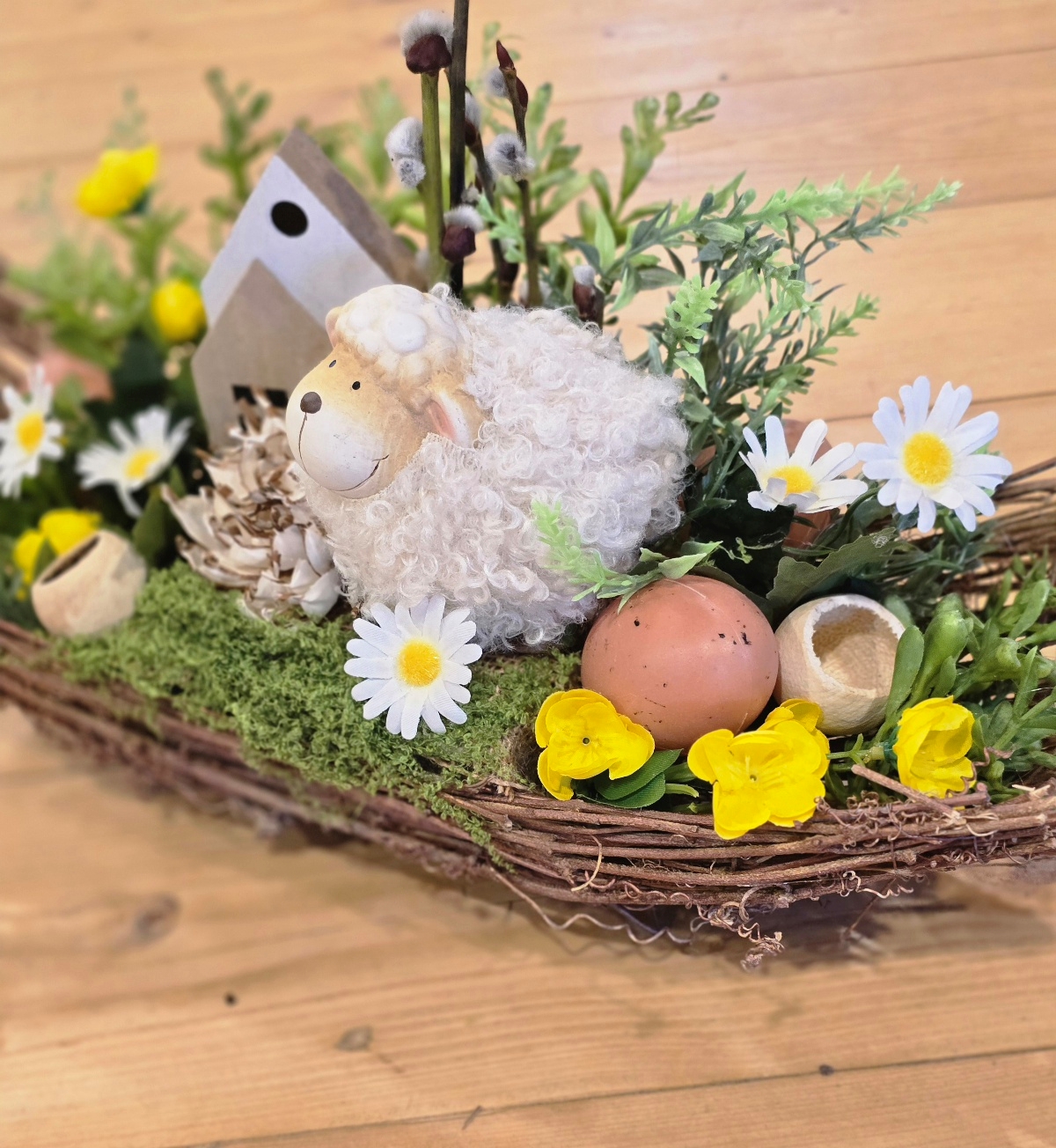 Veľkonočná dekorácia s ovečkou – jarný a veľkonočný aranžmán