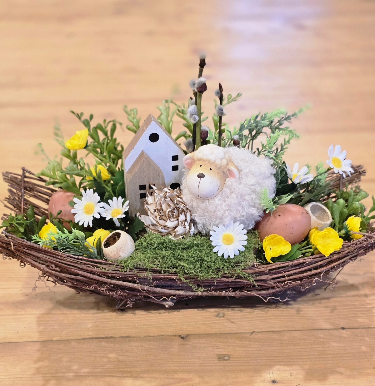 Ručne aranžovaná veľkonočná dekorácia, ktorá symbolizuje jar, nový život a sviatočnú pohodu. Dominantou je ovečka doplnená o drevený domček, živé bahniatka a jarné kvety a prírodnú zeleň.