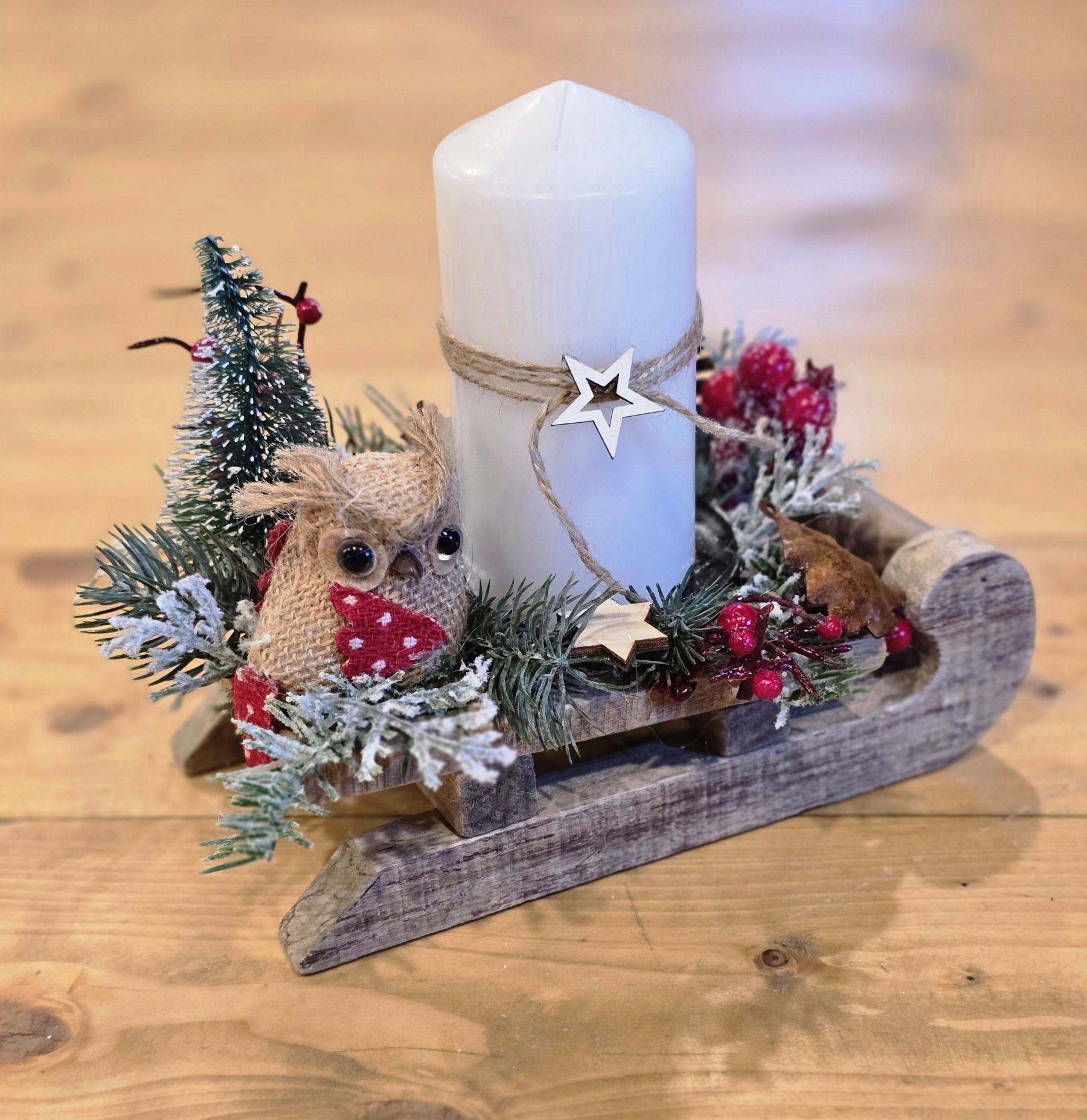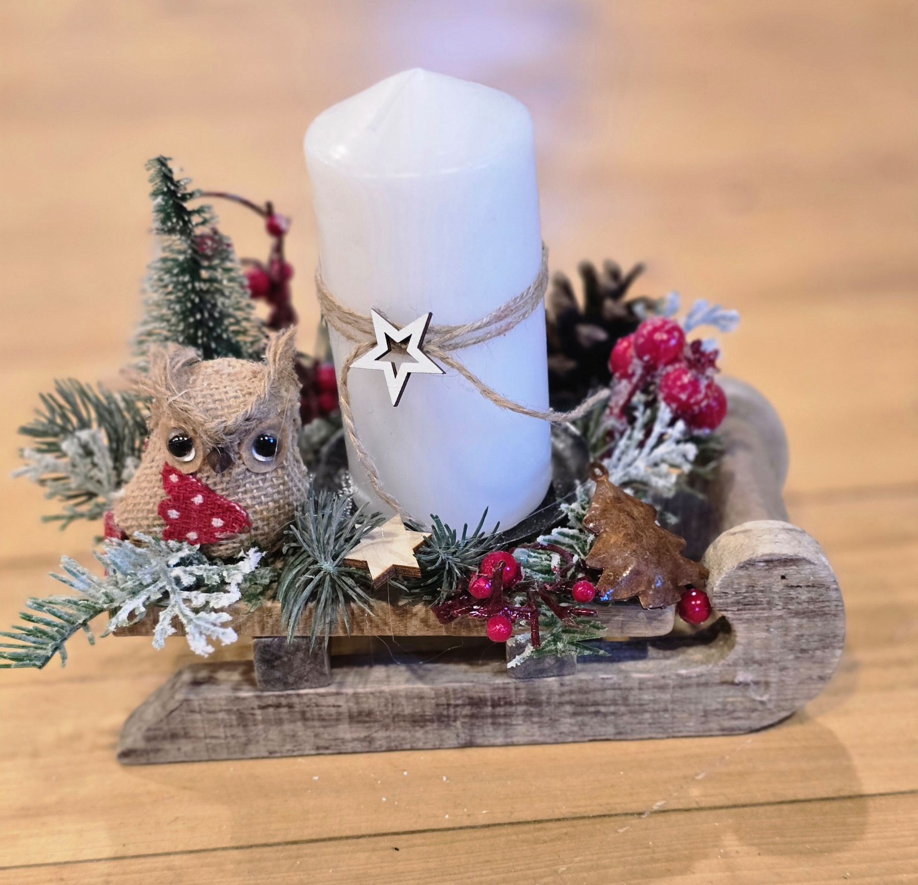 Originálny ručne vyrábaný vianočný svietnik umiestnený na drevených saniach, ladený do prírodných a zimných tónov. Dominantou aranžmánu je biela sviečka, doplnená o prírodné ihličie, šišky, bobuľky a drevené dekorácie. Milým detailom je zimná postavička, ktorá dodáva svietniku hravý a útulný charakter.