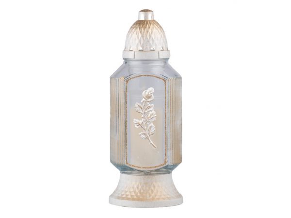 Sklenený kahanec patrí medzi tradičné a najobľúbenejšie spôsoby uctenia si pamiatky zosnulých. Tento elegantný lampáš je vyrobený z kvalitného bieleho skla s dekoratívnou 3D perleťovou ružou a s plastovým vrchnákom, ktorý chráni plameň pred vetrom a dažďom.