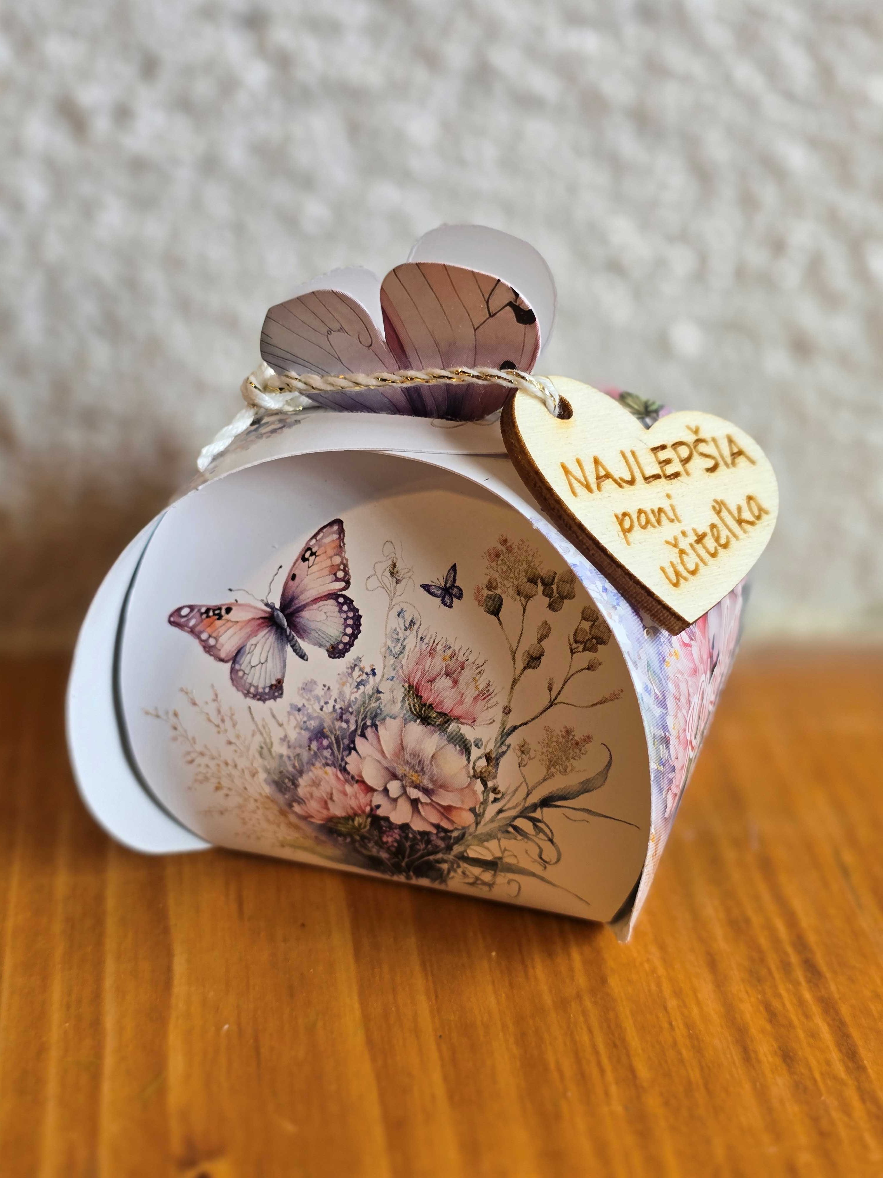 Voňavý darček pre pani učiteľku v kvetinovej krabičke s personalizovaným srdiečkom „Najlepšia pani učiteľka“. Originálny darček na koniec školského roka.