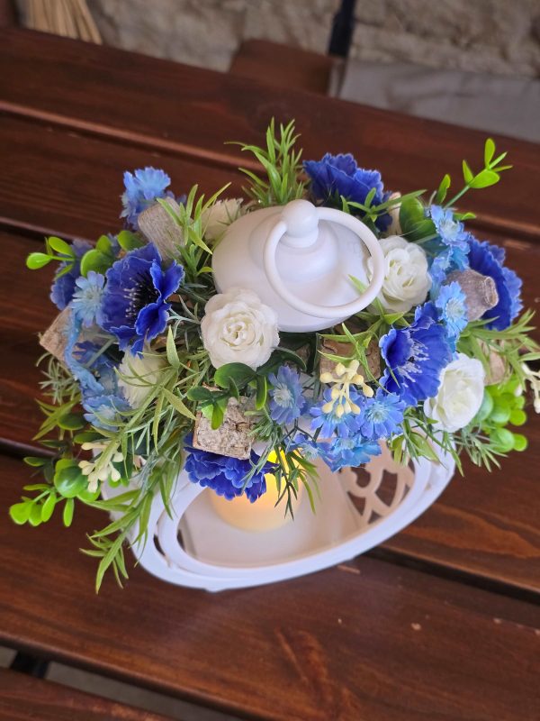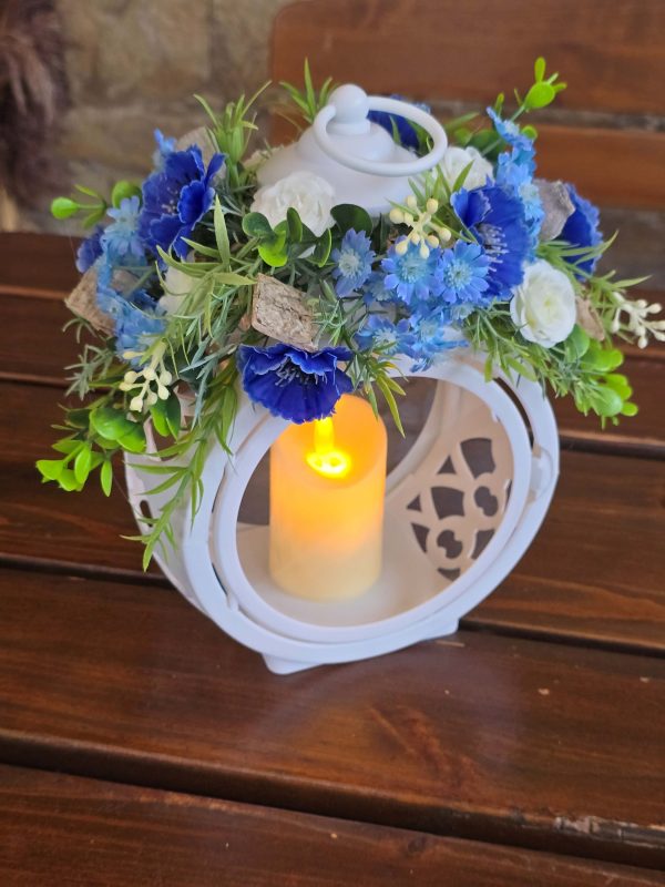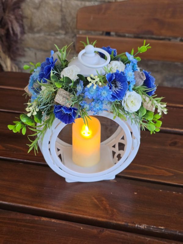Krásna smútočná dekorácia lampáš – svietnik, ozdobený umelými kvetmi, ideálna ako prejav úcty pri spomienke na blízku osobu . Dominantným prvkom je biely lampáš – do ktorého sa dá vložiť LED sviečka. Táto dekorácia je vhodná na hrob alebo smútočné obrady a pôsobí dôstojne a vkusne.