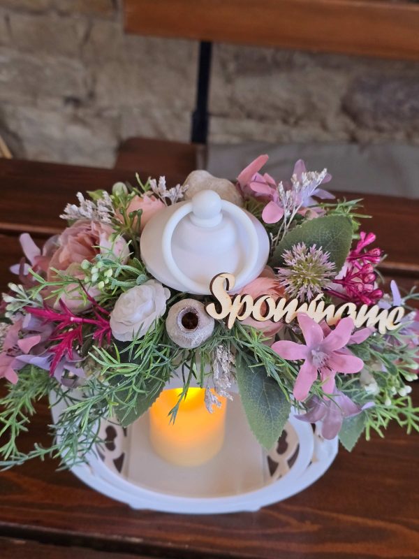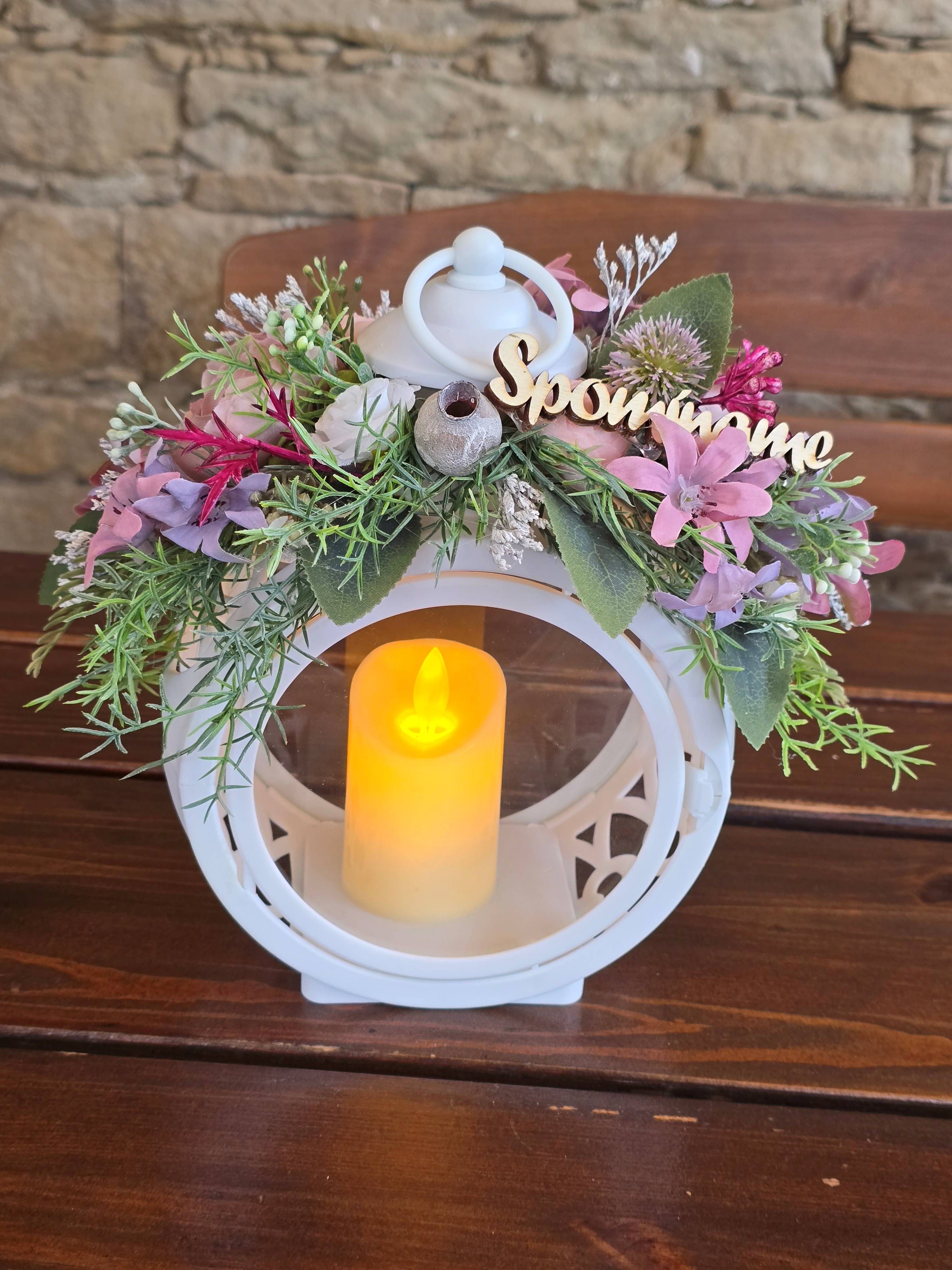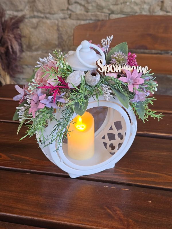 Krásna smútočná dekorácia lampáš – svietnik, ozdobený umelými kvetmi, ideálna ako prejav úcty pri spomienke na blízku osobu . Dominantným prvkom je biely lampáš – do ktorého sa dá vložiť LED sviečka. Táto dekorácia je vhodná na hrob alebo smútočné obrady a pôsobí dôstojne a vkusne.