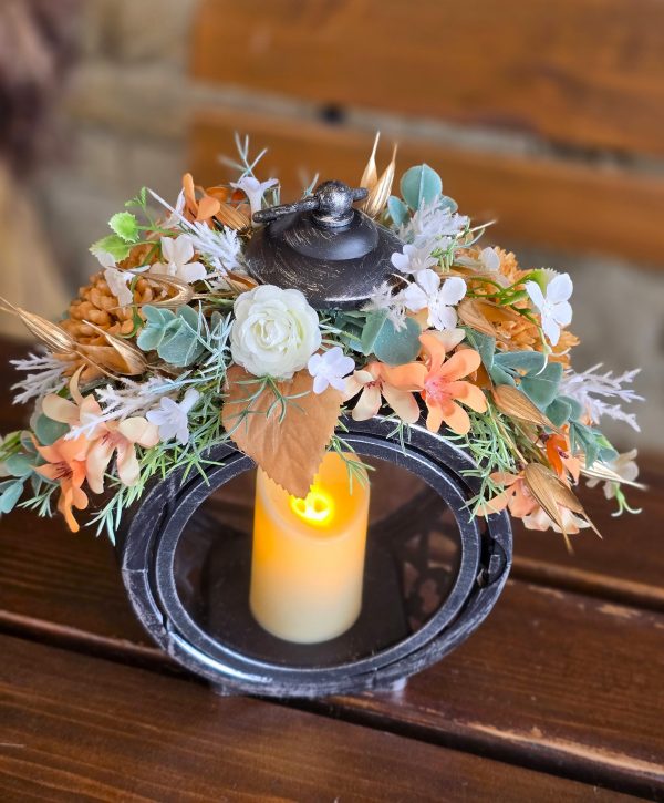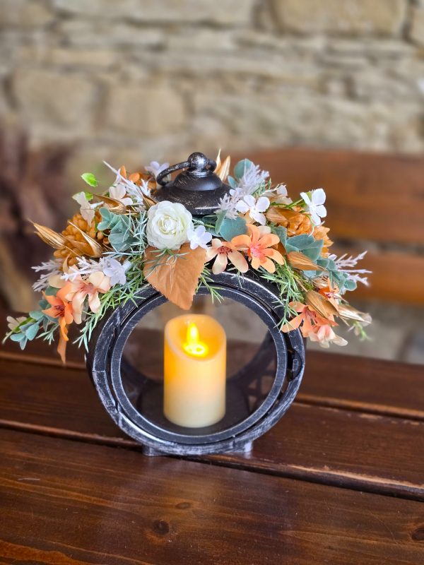 Krásna smútočná dekorácia lampáš – svietnik, ozdobený umelými kvetmi, ideálna ako prejav úcty pri spomienke na blízku osobu . Dominantným prvkom je biely lampáš – do ktorého sa dá vložiť LED sviečka. Táto dekorácia je vhodná na hrob alebo smútočné obrady a pôsobí dôstojne a vkusne.