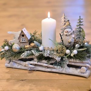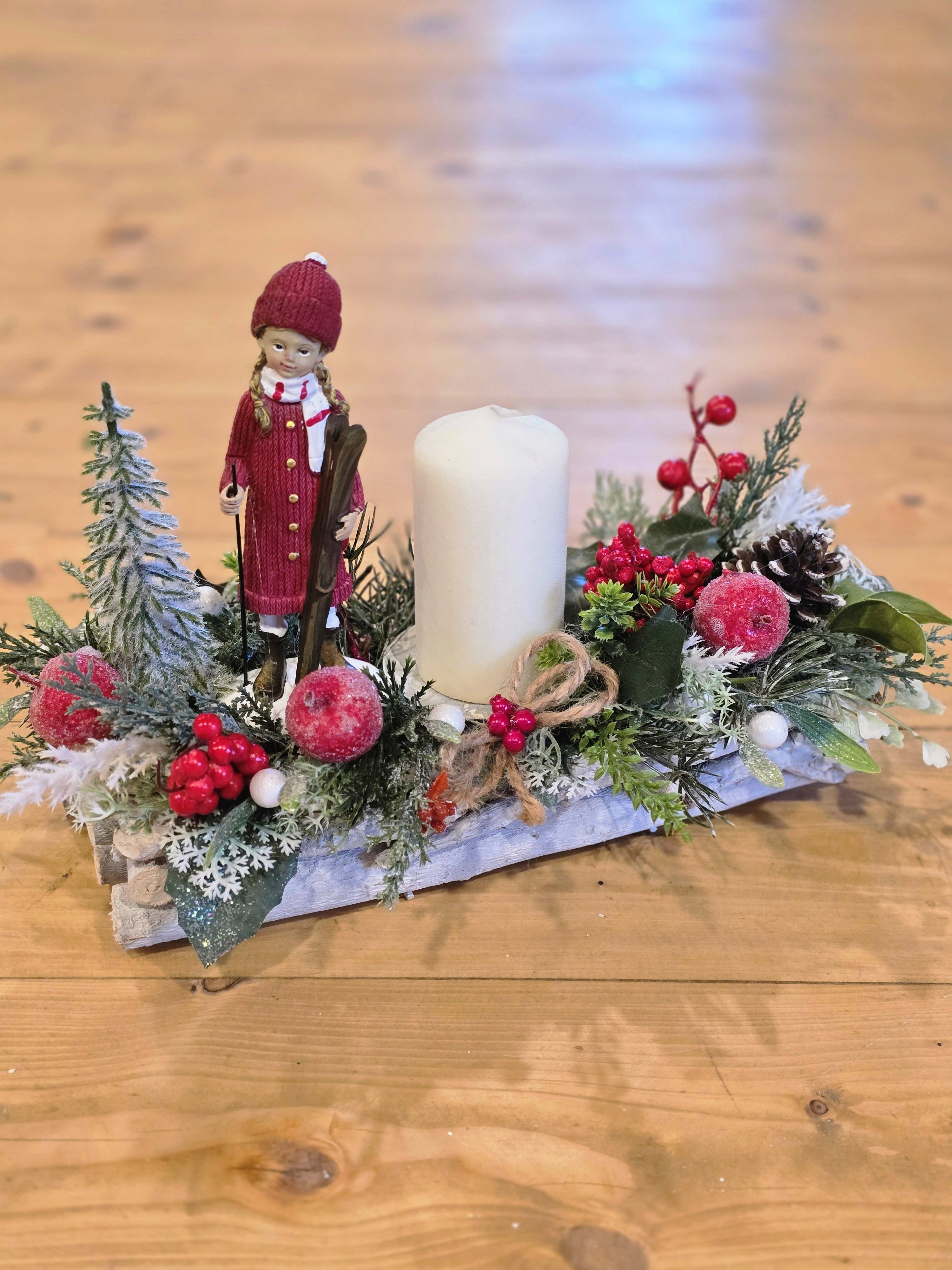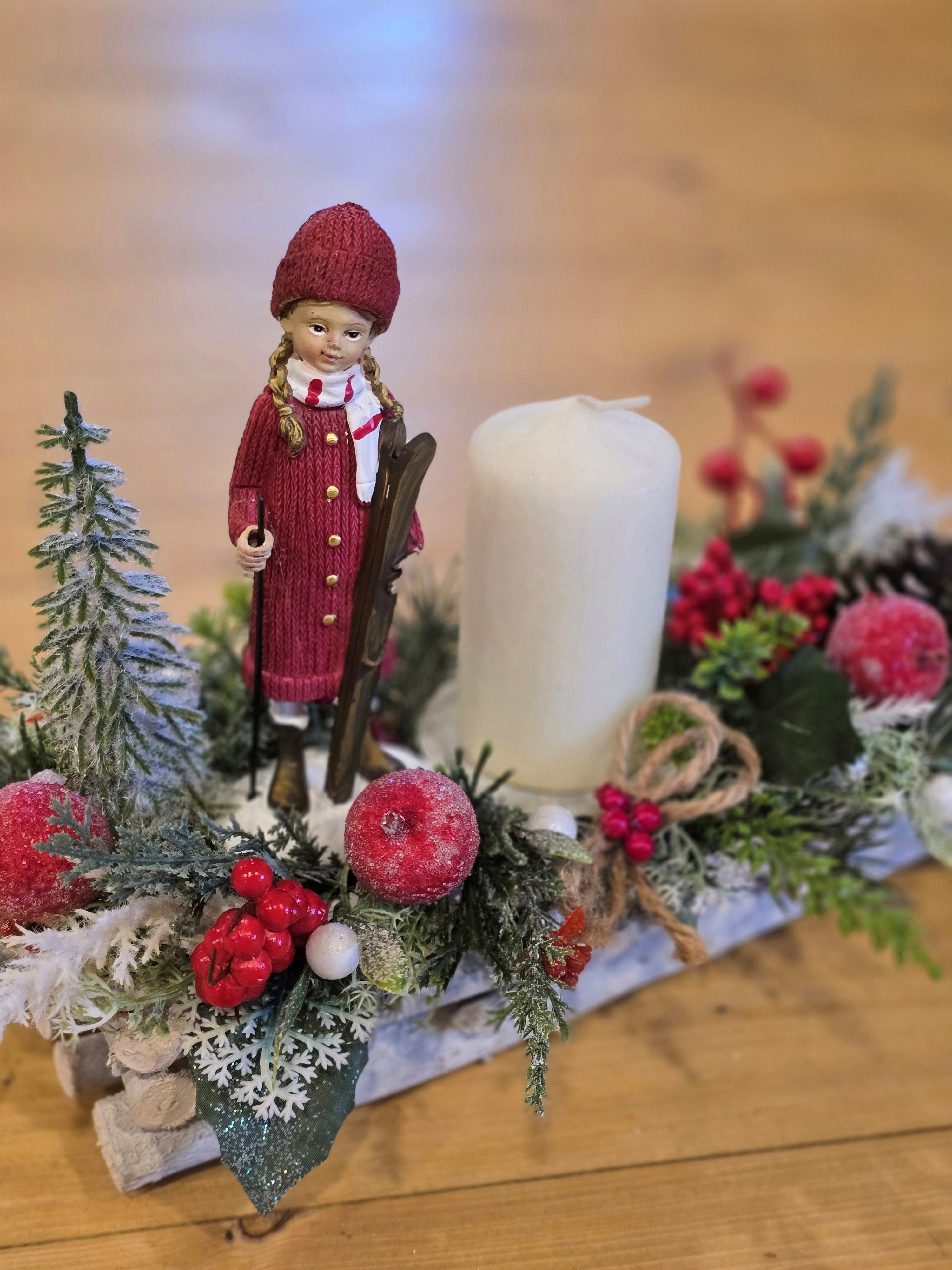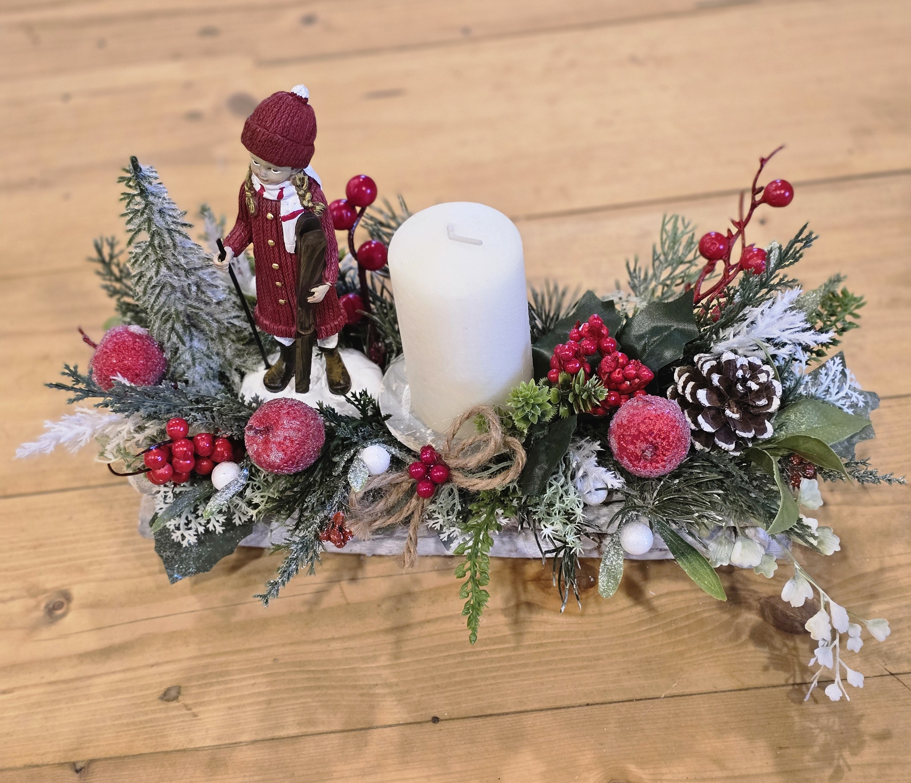 Tradičný ručne vyrábaný vianočný svietnik, ladený do červenej, zelenej a prírodnej farby, inšpirovanej klasickými Vianocami. Dominantou aranžmánu je biela sviečka, doplnená o zimnú postavičku v červenom kabátiku, prírodné ihličie, šišky, červené bobuľky a dekoratívne vianočné ozdoby.