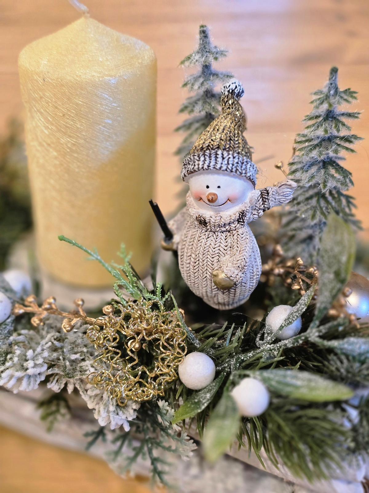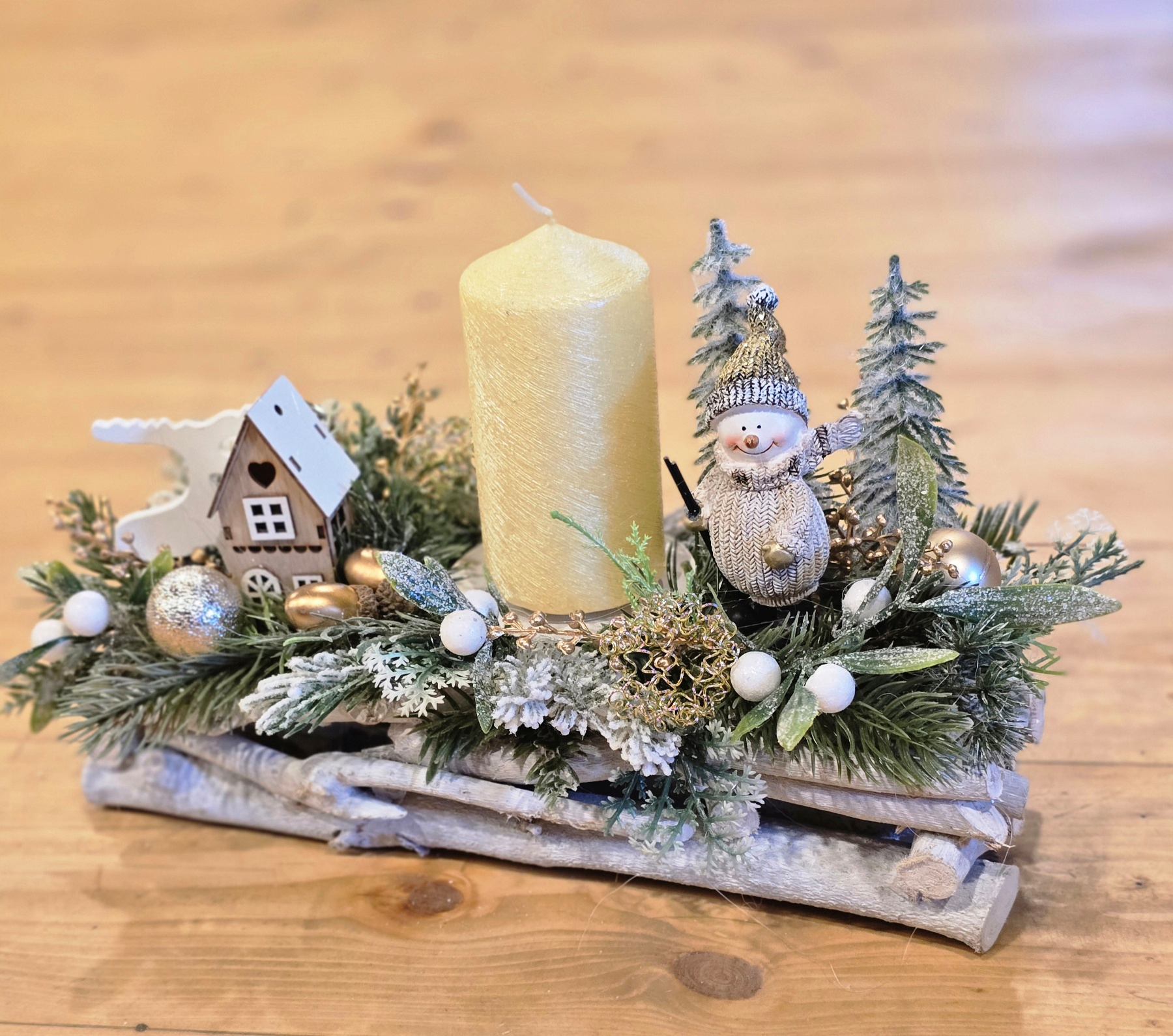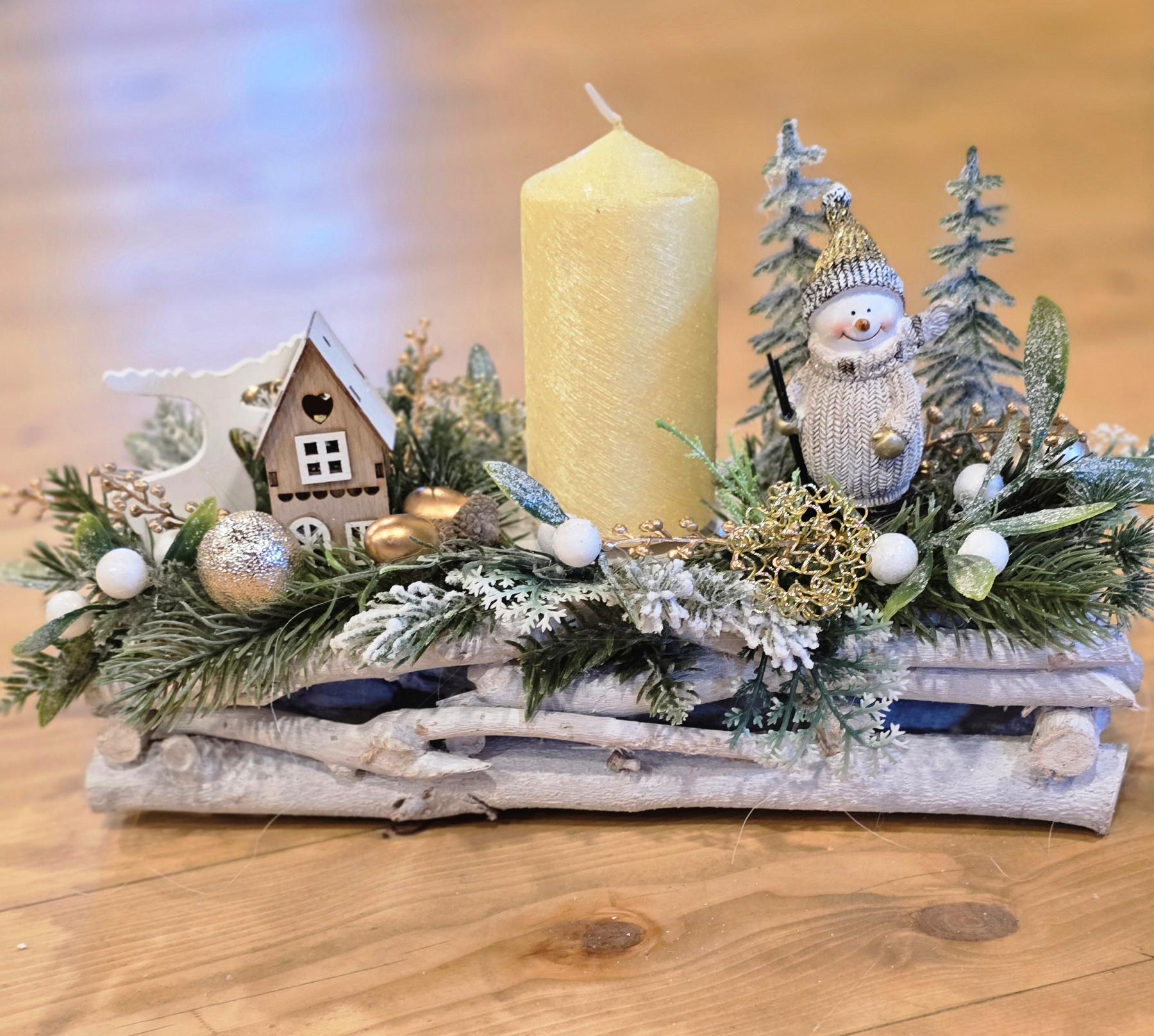Elegantný ručne vyrábaný vianočný svietnik, ladený do zlatých, bielych a prírodných tónov, ktorý pôsobí slávnostne a nadčasovo. Dominantou aranžmánu je zlatá sviečka, doplnená o prírodné ihličie, zasnežené vetvičky, vianočné ozdoby, drevený domček a zimnú postavičku.