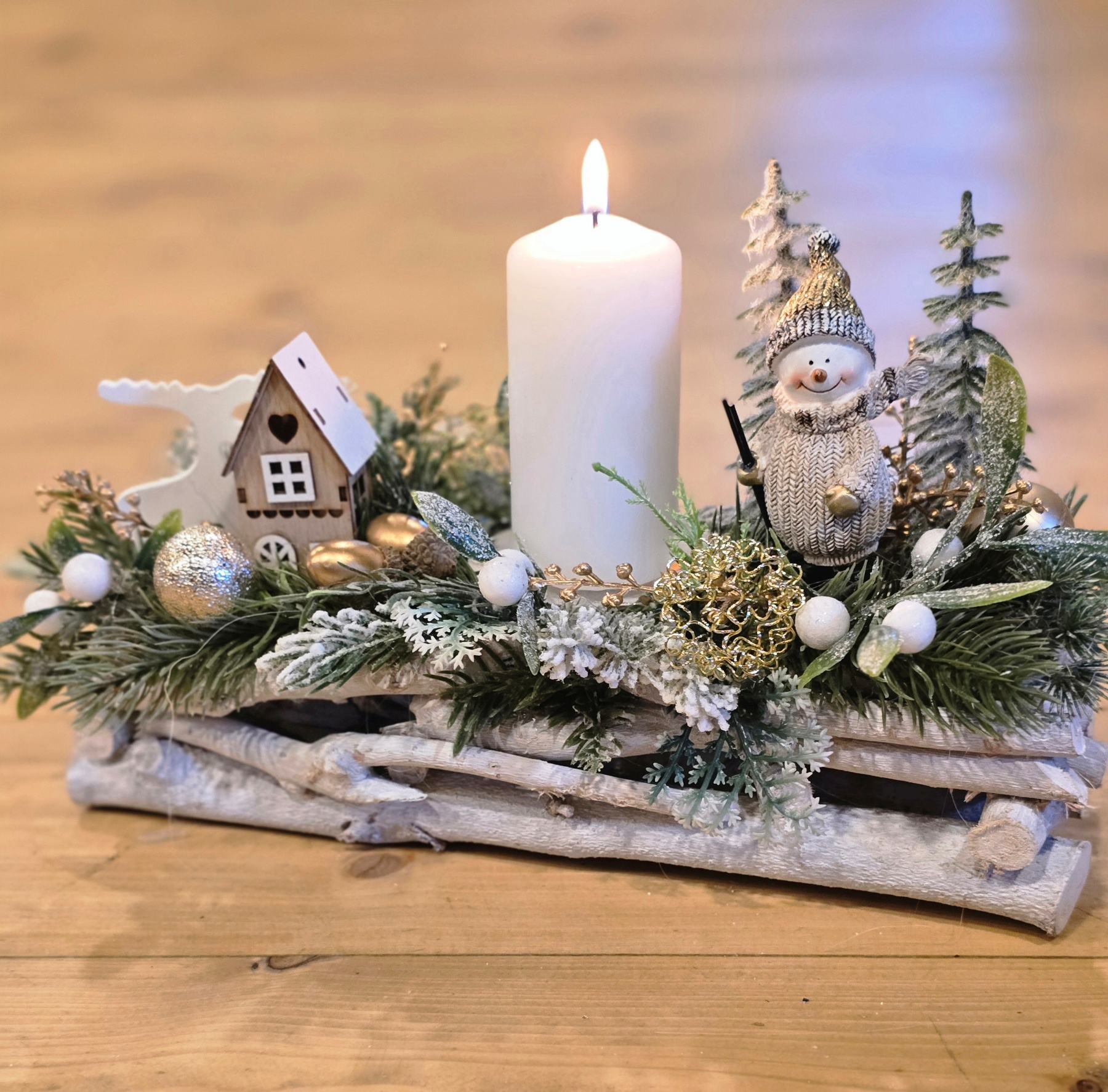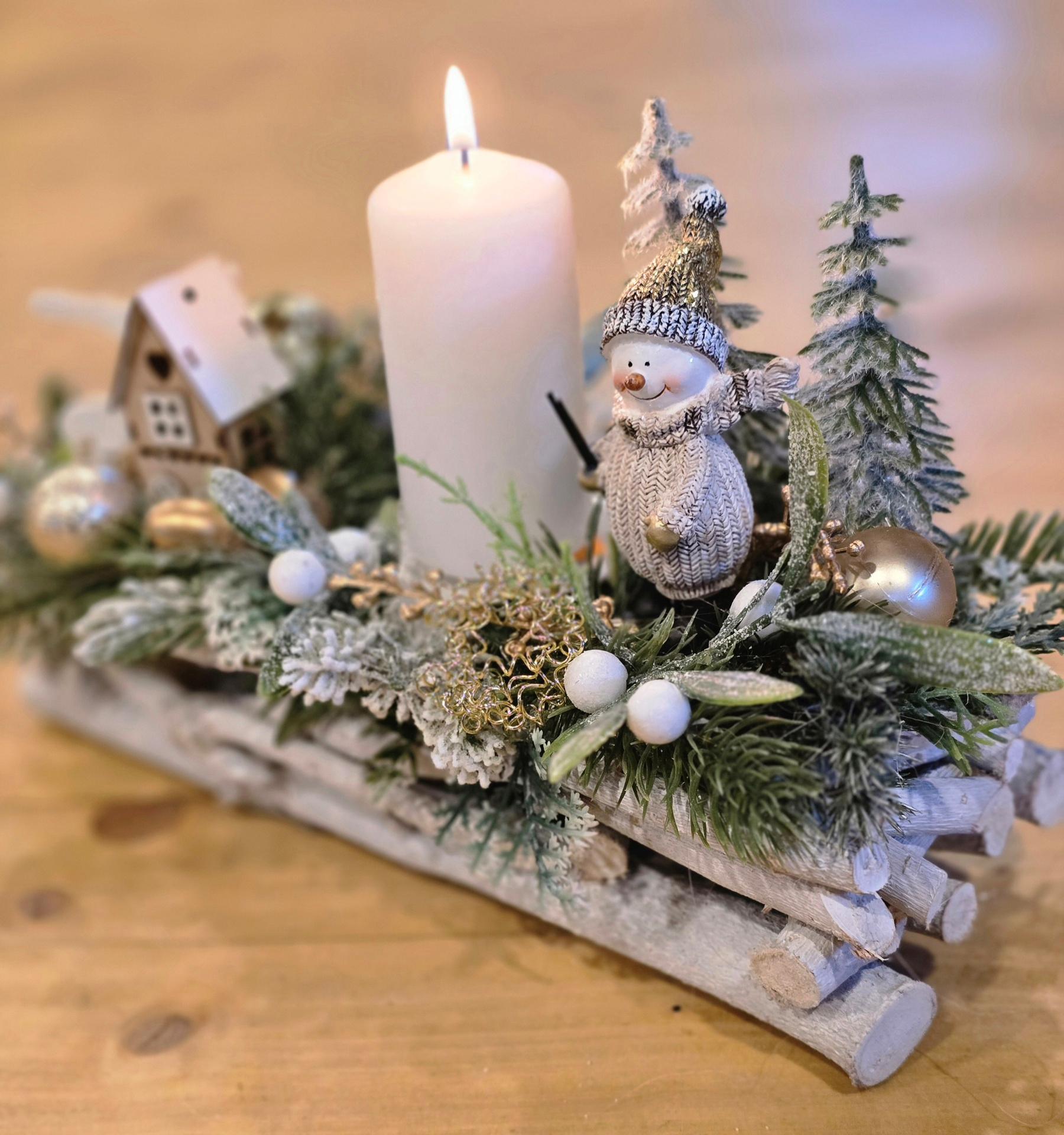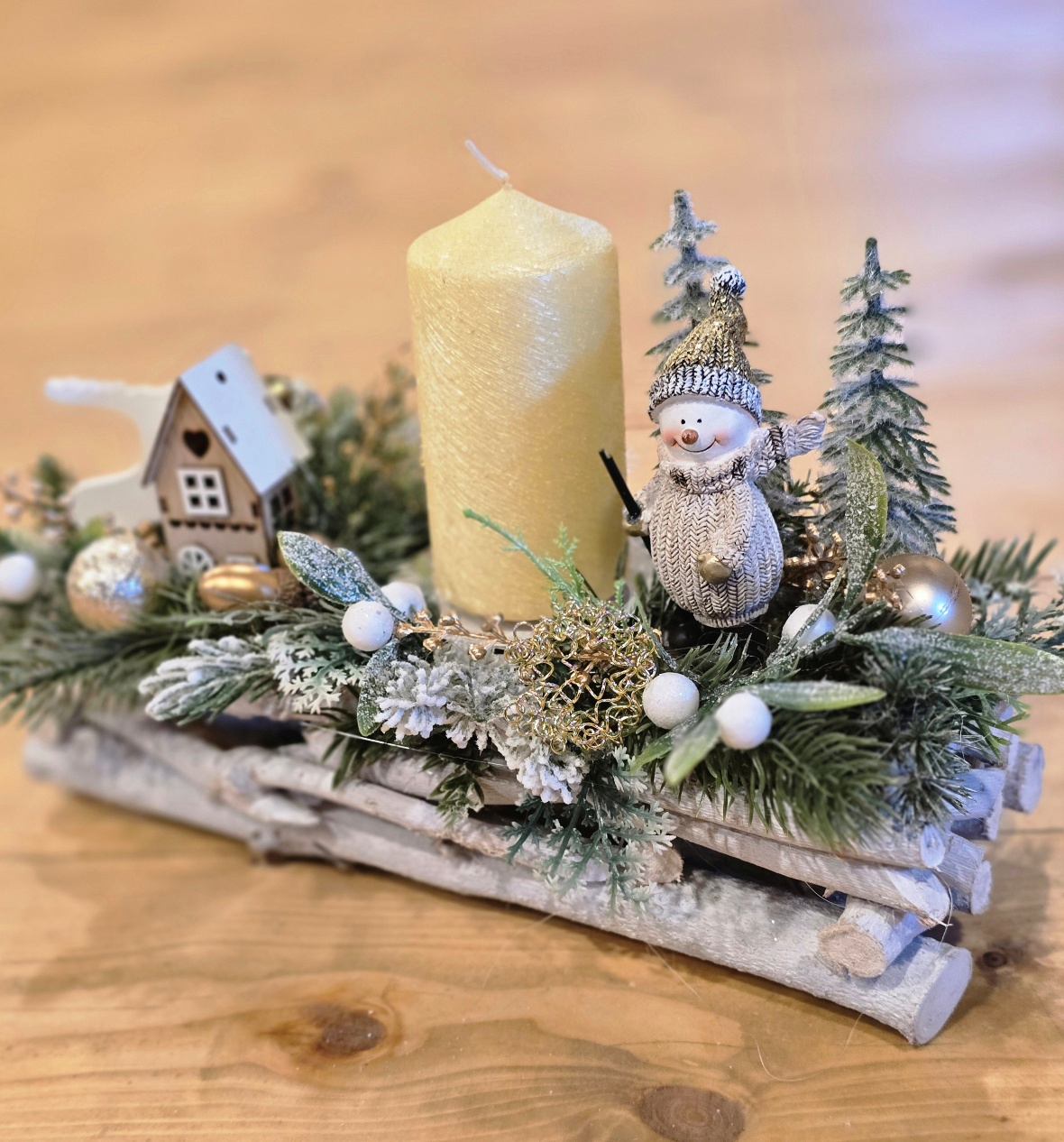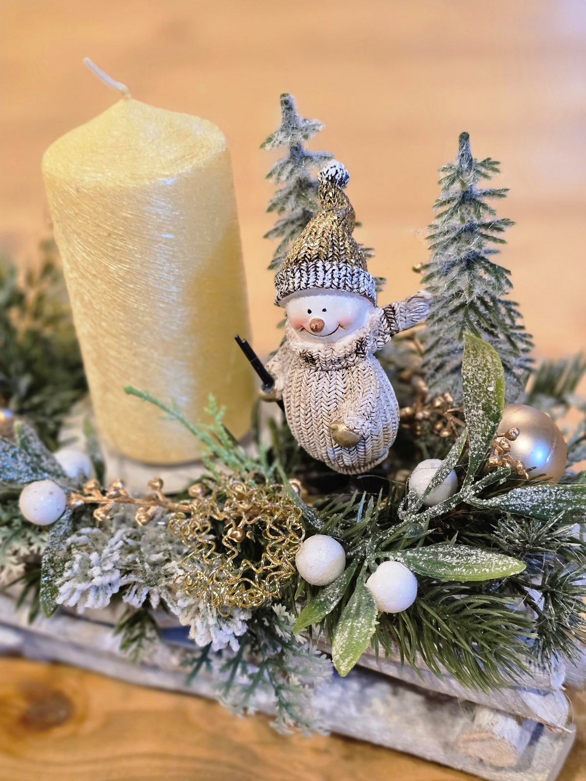 Elegantný ručne vyrábaný vianočný svietnik, ladený do zlatých, bielych a prírodných tónov, ktorý pôsobí slávnostne a nadčasovo. Dominantou aranžmánu je zlatá sviečka, doplnená o prírodné ihličie, zasnežené vetvičky, vianočné ozdoby, drevený domček a zimnú postavičku.