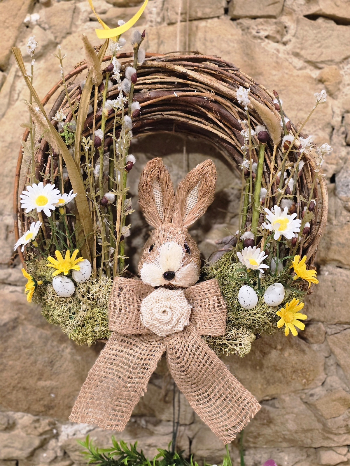 Tento originálny veľkonočný prútený veniec na dvere so zajačikom je krásnou dekoráciou, ktorá prinesie do vášho domova príjemnú jarnú a veľkonočnú atmosféru. Základ venca tvorí prírodné prútie-živé bahniatka doplnené o jemnú zeleň, jarné kvety, dekoratívne veľkonočné vajíčka a dominantný motív roztomilého zajačika.