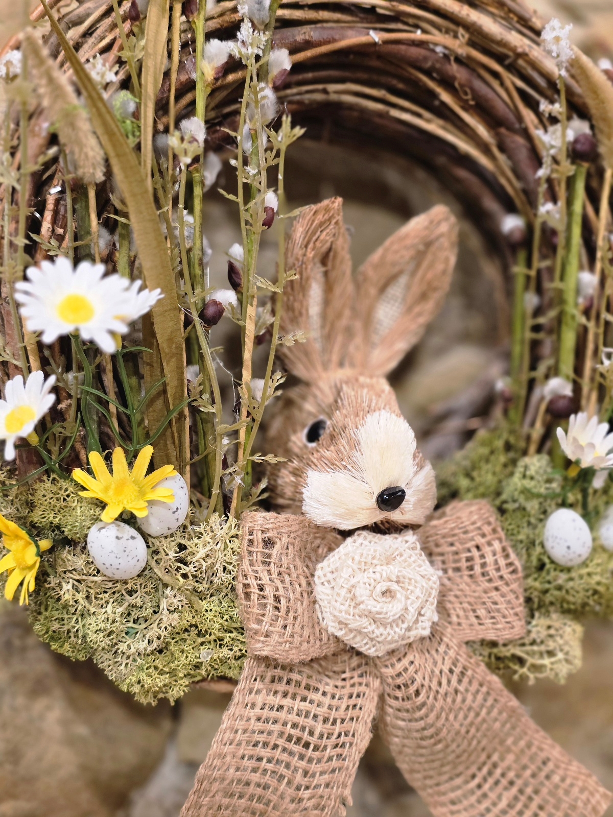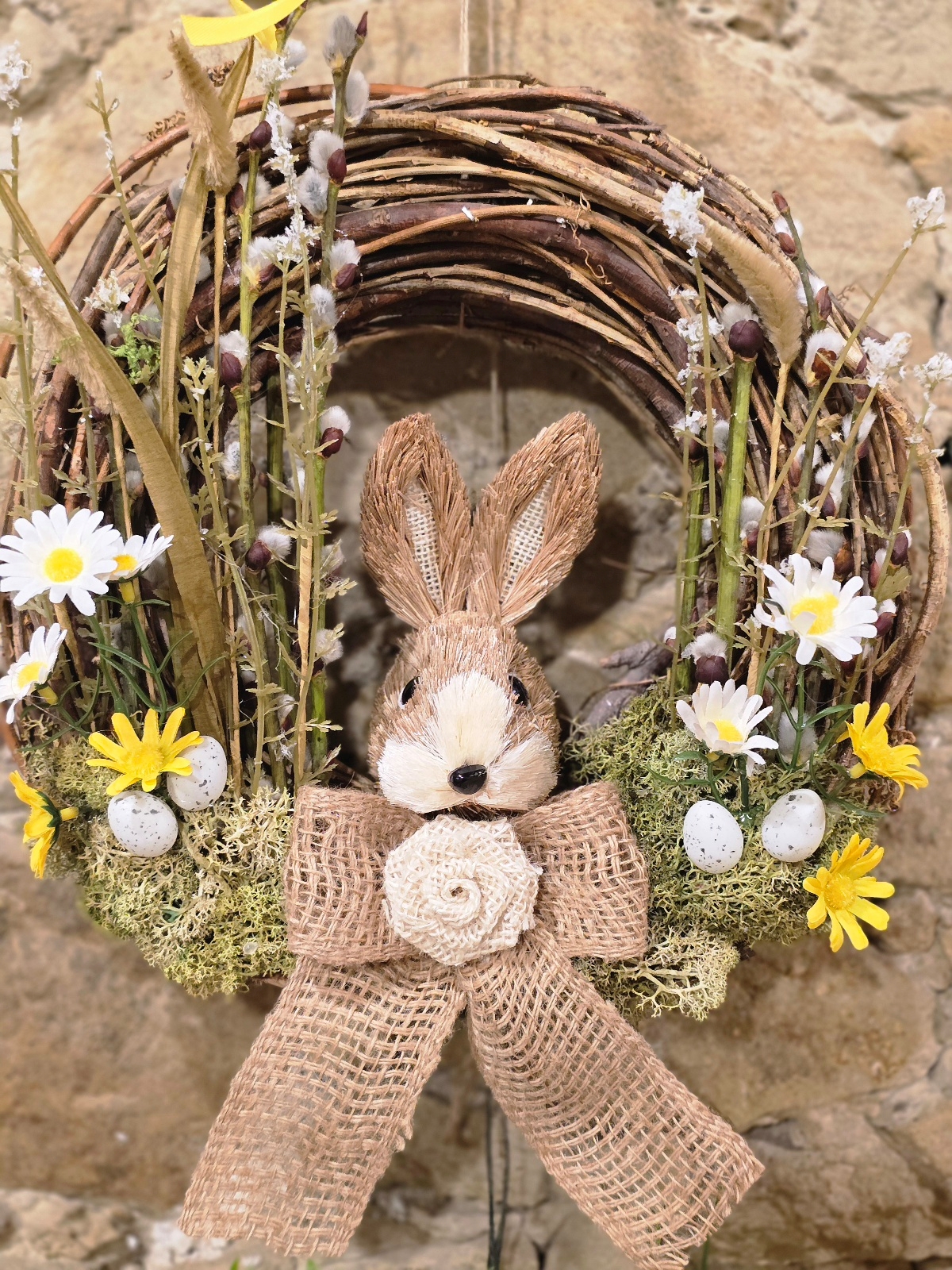 Veľkonočný veniec na dvere so zajačikom v prírodnom štýle