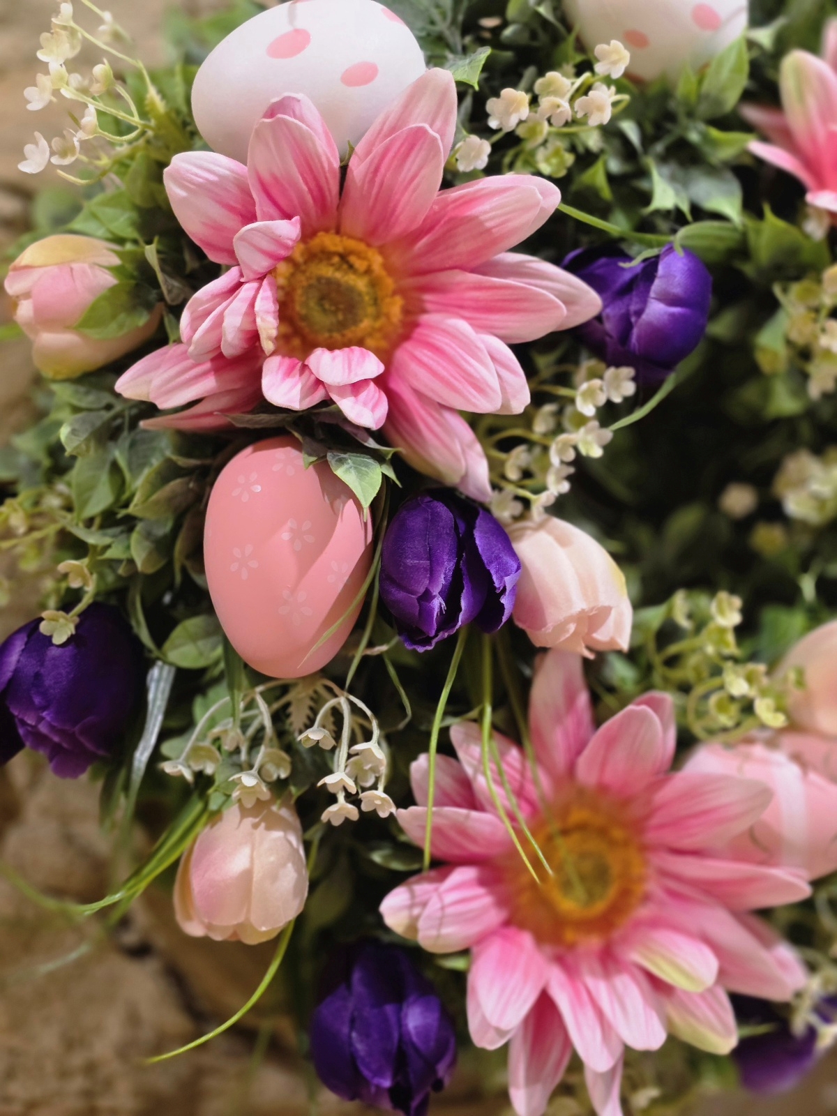 Pastelové farby v kombinácii s výraznými jarnými kvetmi dodávajú vencu elegantný a zároveň hravý vzhľad. Táto veľkonočná dekorácia na dvere krásne oživí vstup do domu a prinesie do interiéru príjemnú sviatočnú náladu.