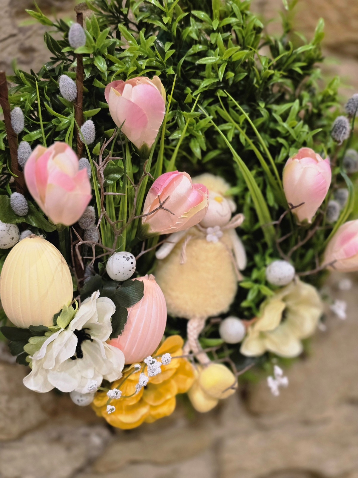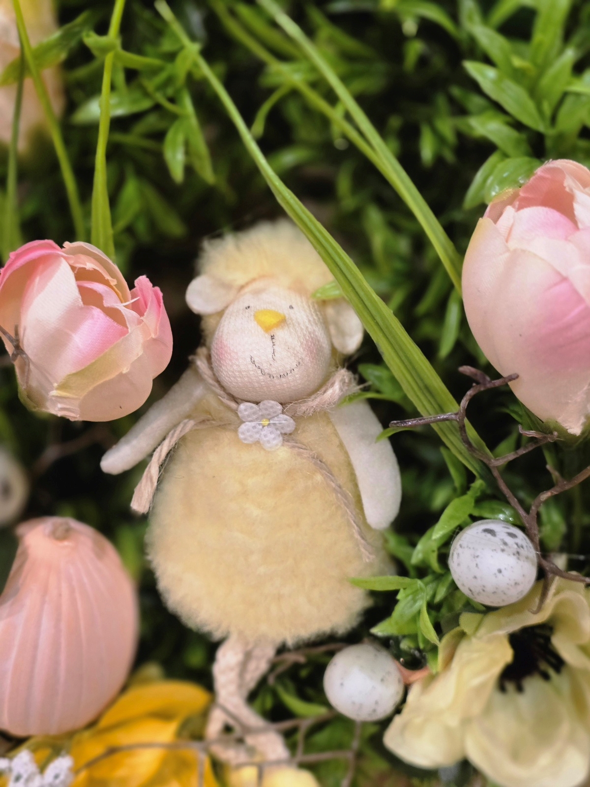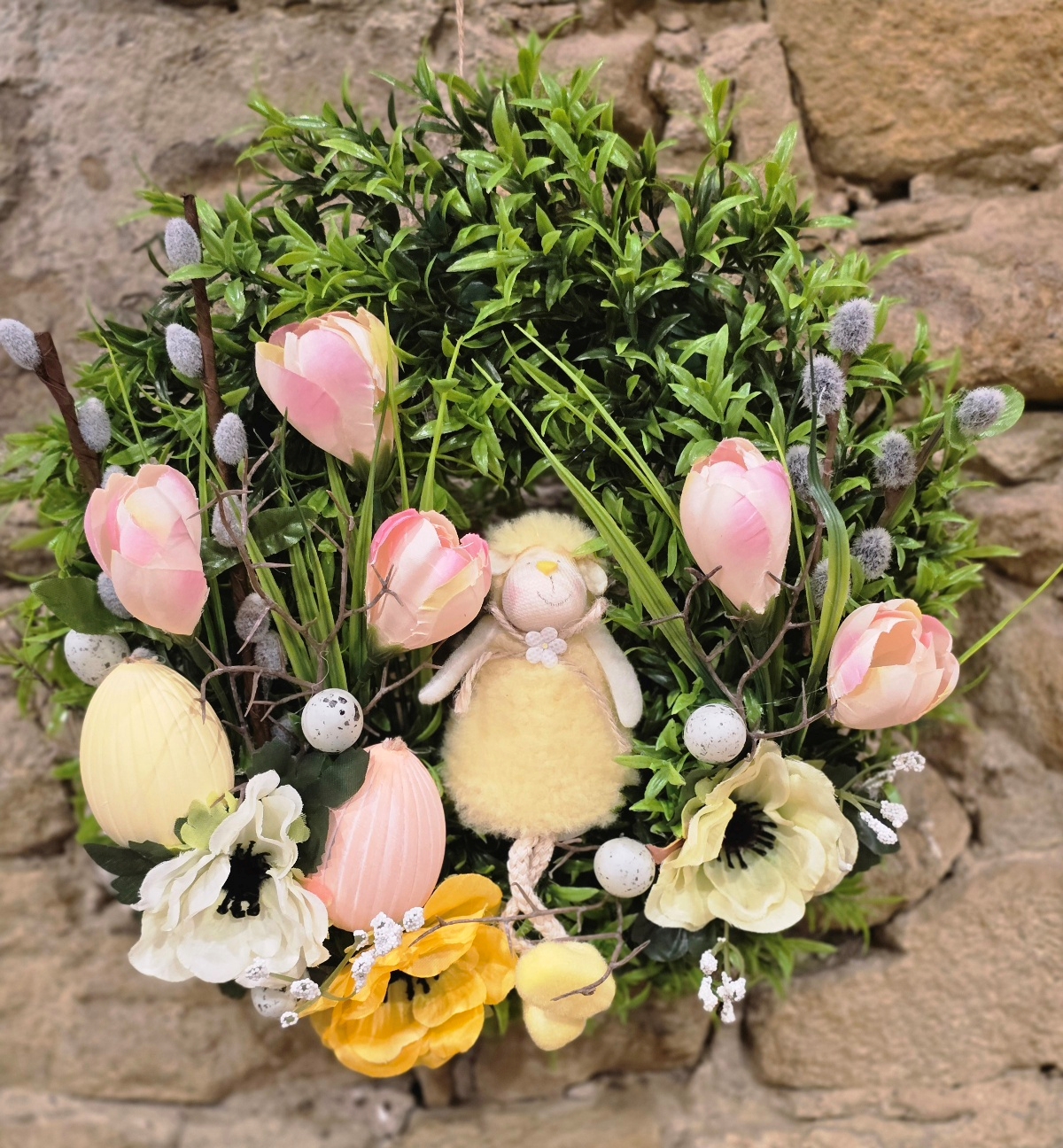 Tento krásny veľkonočný veniec na dvere s ovečkou je jemnou a veselou dekoráciou, ktorá prinesie do vášho domova pravú jarnú a veľkonočnú atmosféru. Bohatý zelený veniec je zdobený ružovými tulipánmi, jarnými kvetmi, dekoratívnymi veľkonočnými vajíčkami a vetvičkami bahniatok, ktoré symbolizujú príchod jari. Dominantou celej dekorácie je roztomilá ovečka, ktorá dodáva vencu hravý a sviatočný charakter.