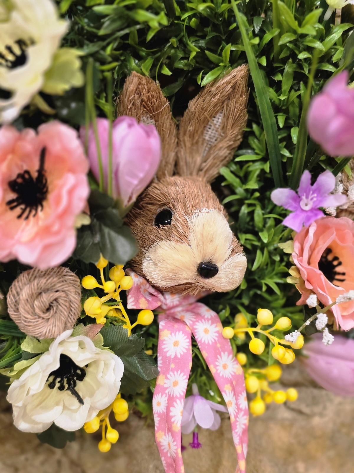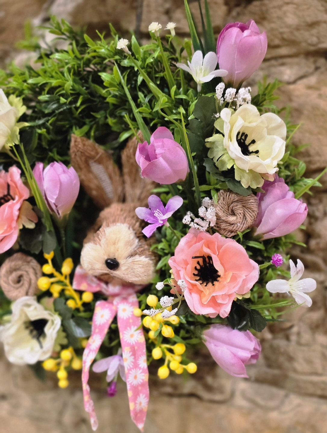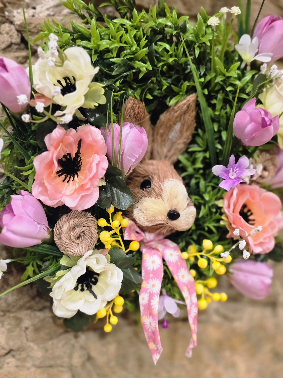 Tento nádherný veľkonočný veniec na dvere so zajačikom je dokonalou dekoráciou, ktorá prinesie do vášho domova sviežu jarnú atmosféru a veľkonočnú náladu. Bohatý zelený základ je doplnený jemnými ružovými tulipánmi, jarnými kvetmi, drobnými dekoráciami a roztomilým zajačikom, ktorý je dominantou celého venca.