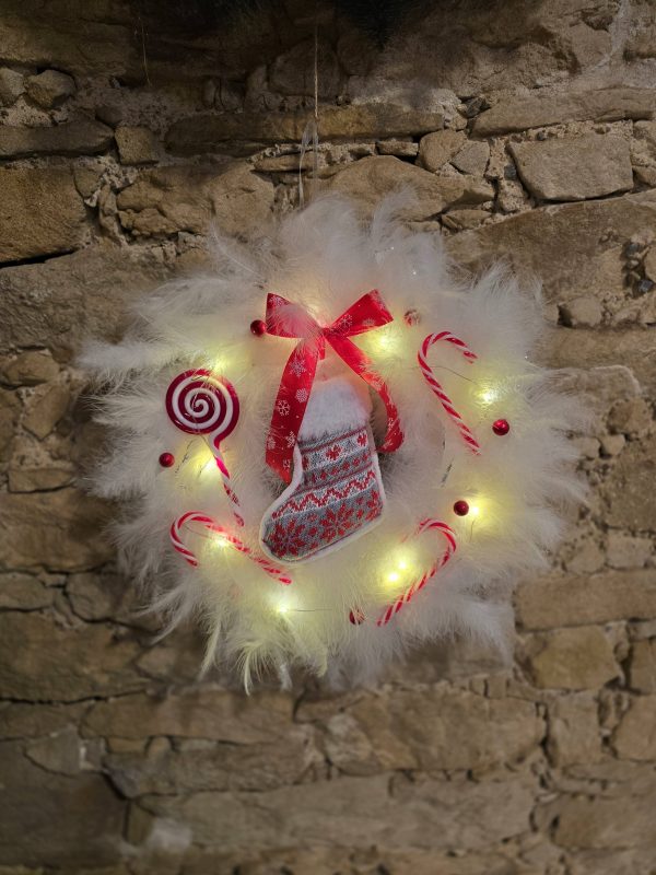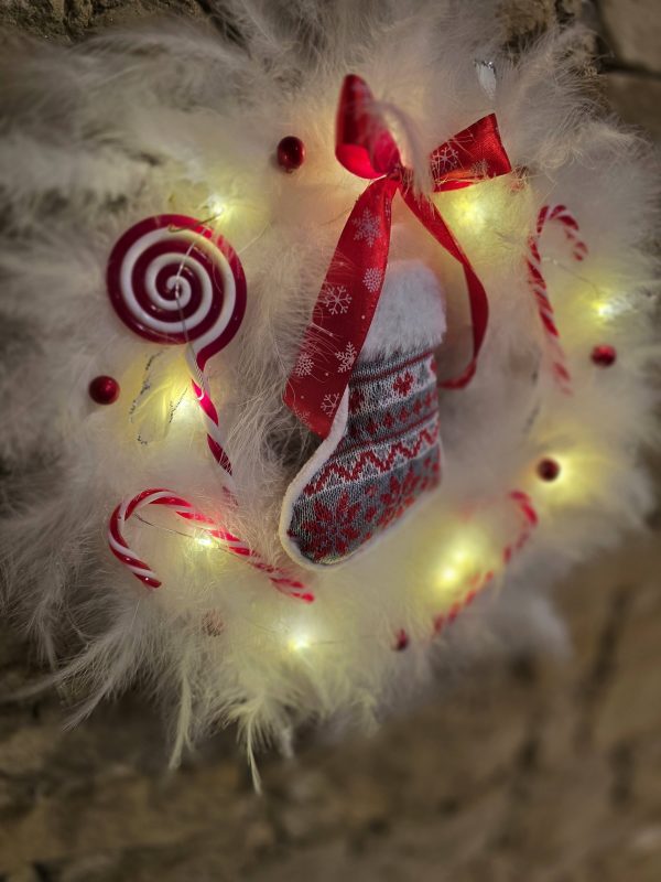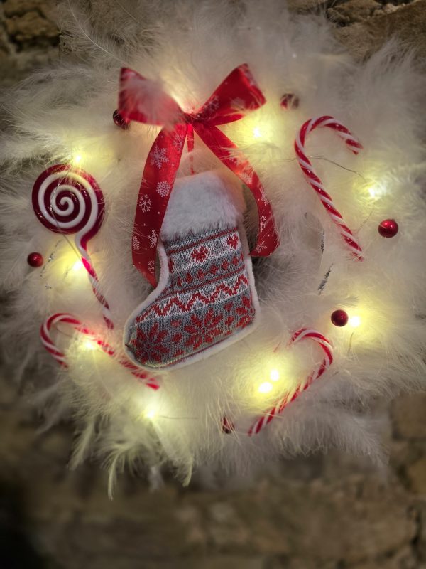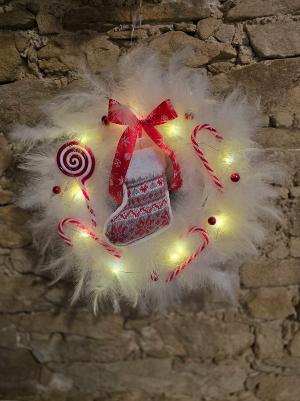 Veniec z peria, priemer cca 30 cm. Dozdobený umelými doplnkami a štrikovanou čižmičkou. Podsvietený je LED svetlom.