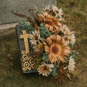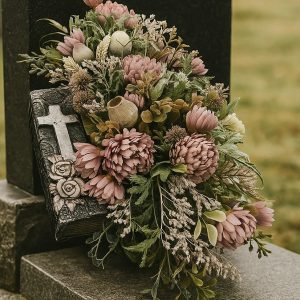 0 out of 5(0)Smútočný aranžmán s kvetmi v prírodných odtieňoch, doplnený elegantnou dekoračnou knihou so zlatým krížom. Dôstojná a trvácna dekorácia na cintorín. Kvety su sušené a umelé. Aranžmán nemá podstavec – je zospodu rovný