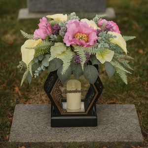Krásny smútočný veniec, ozdobená umelými kvetmi a prírodnými doplnkami ideálny ako prejav úcty pri spomienke na blízku osobu . Táto dekorácia je vhodná na hrob alebo smútočné obrady a pôsobí dôstojne a vkusne.