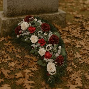 Krásny smútočný veniec, ozdobená umelými kvetmi a prírodnými doplnkami ideálny ako prejav úcty pri spomienke na blízku osobu . Táto dekorácia je vhodná na hrob alebo smútočné obrady a pôsobí dôstojne a vkusne.