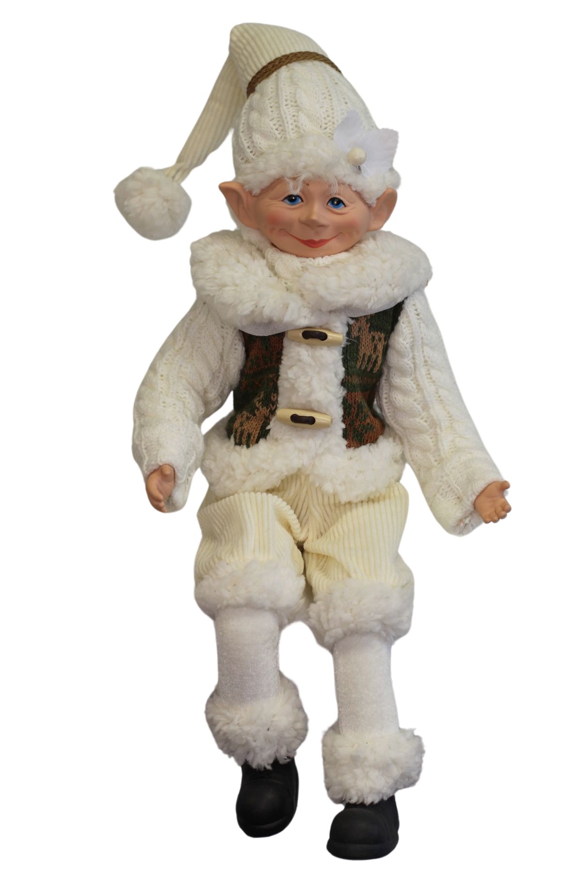Tento vianočný škriatok v bielom prinesie do vášho domova hrejivú atmosféru zimných sviatkov. Je oblečený do mäkkého pleteného svetra, nohavíc s huňatým lemom a čiapky s brmbolcom. Vďaka detailnému spracovaniu a jemným farbám pôsobí elegantne, no zároveň hravo. Je ohybný, s drôtom vo vnútri, preto sa dá prispôsobiť polohe akú práve potrebujete. Škriatok je mimoriadne obľúbená vianočná dekorácia, je vhodný aj ako darček