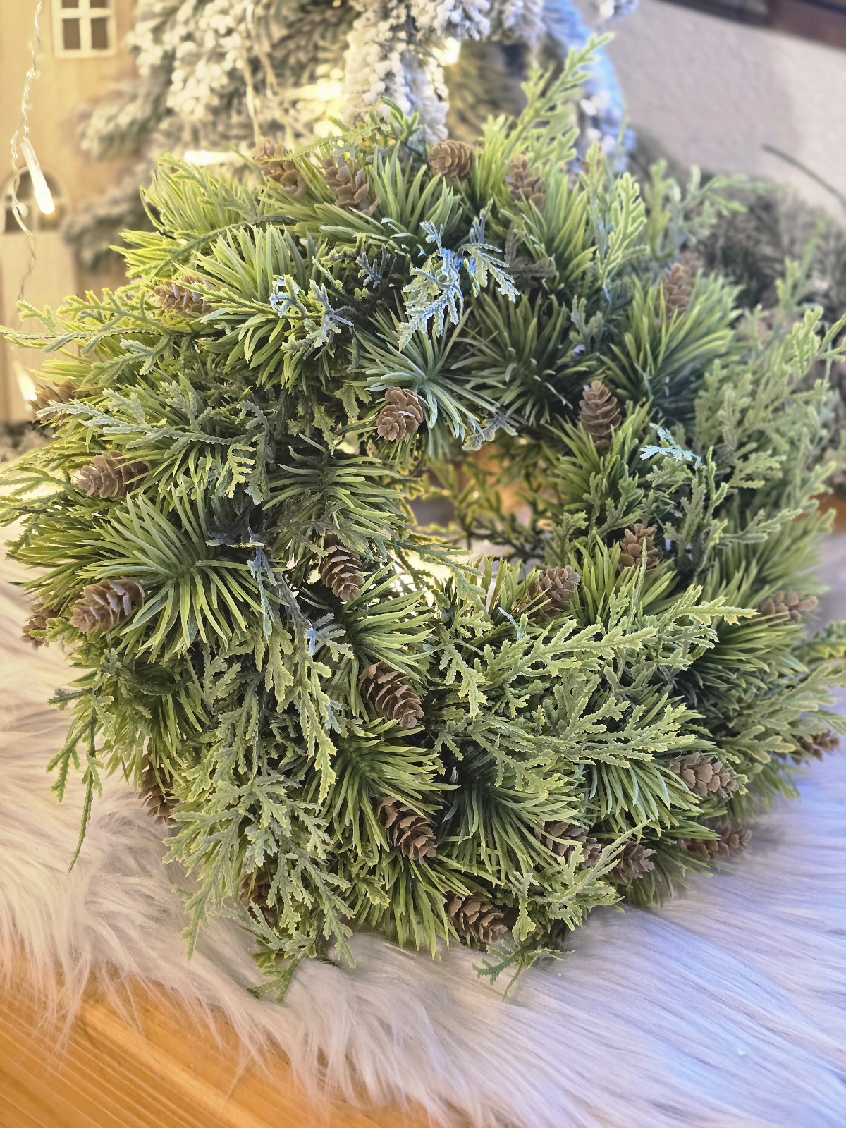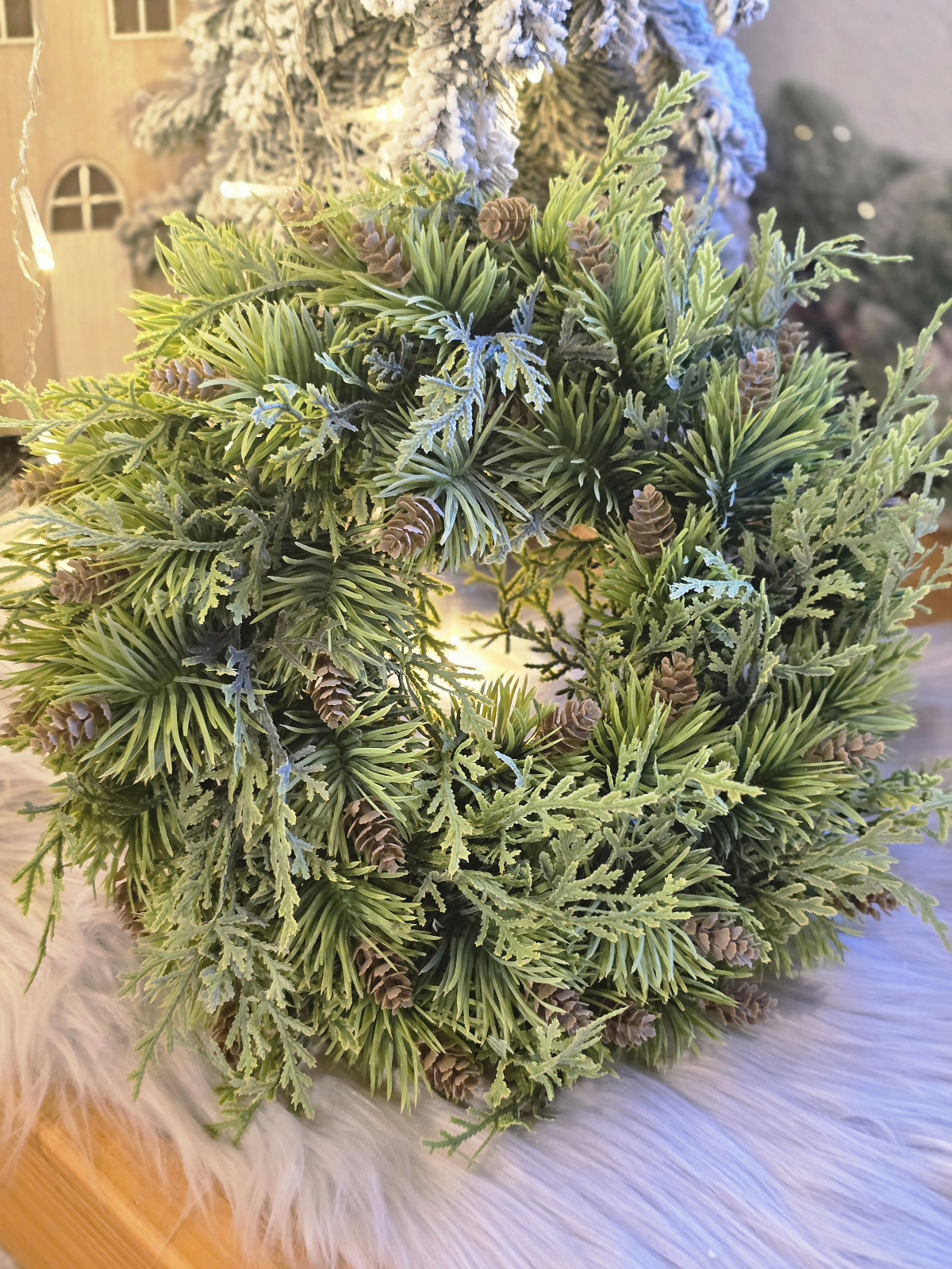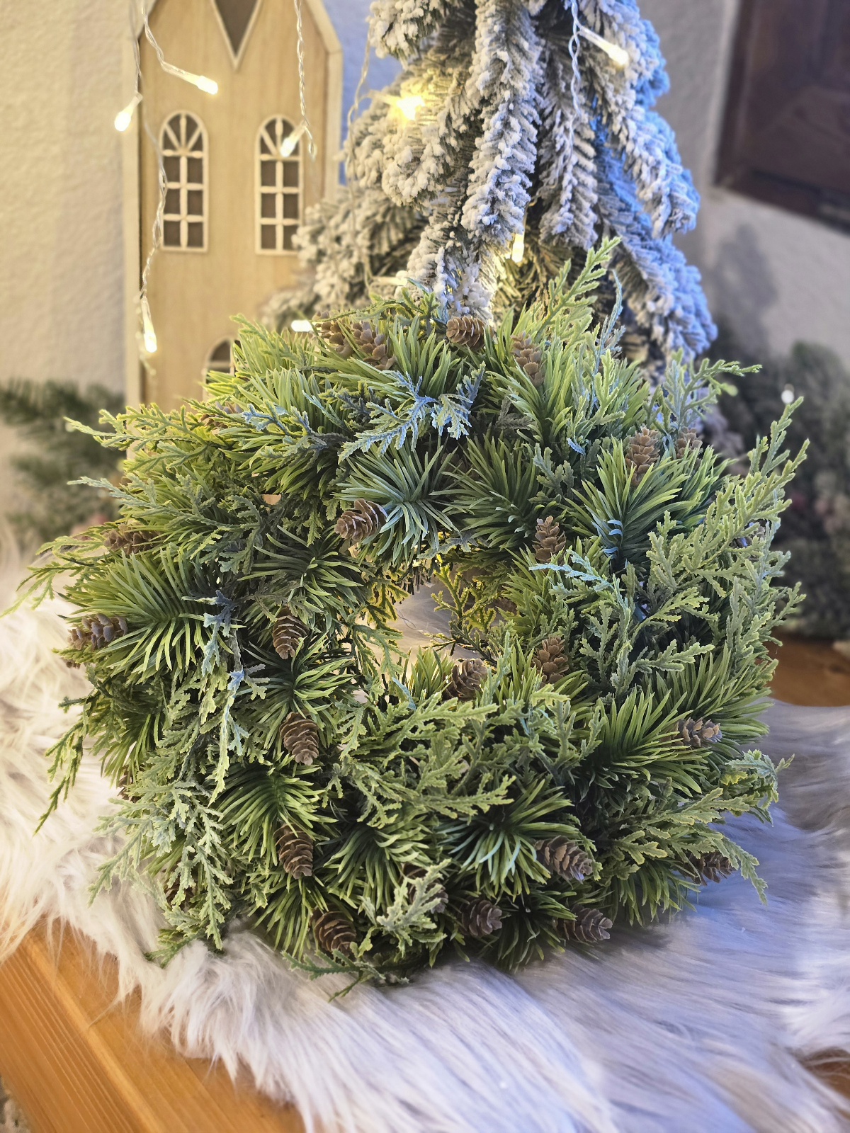 Vianočný čečinový veniec je ikonickou dekoráciou, ktorá okamžite navodí sviatočnú atmosféru vo vašej domácnosti. Tento elegantný veniec na Vianoce je vyrobený z hustej, bohato zdobenej umelej čečiny, ktorá dokonale imituje vzhľad prírodného ihličia – bez opadávania a starostí. Je ideálny na zavesenie na dvere, stenu, okno alebo ako veniec na stôl s adventnými sviečkami.